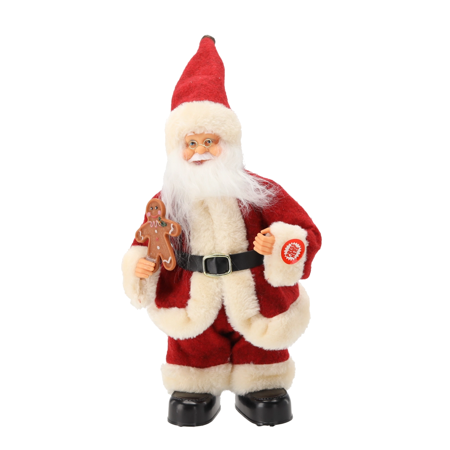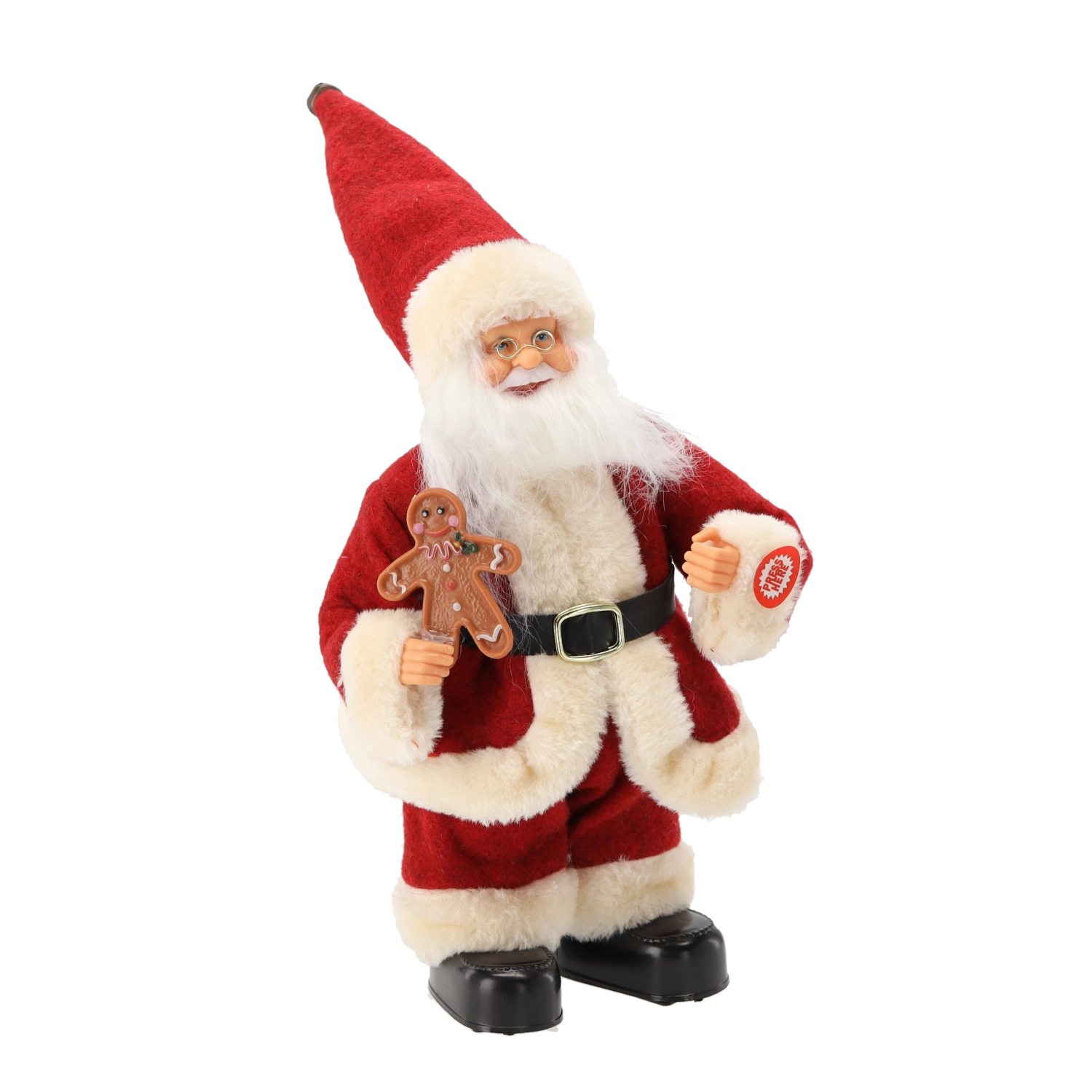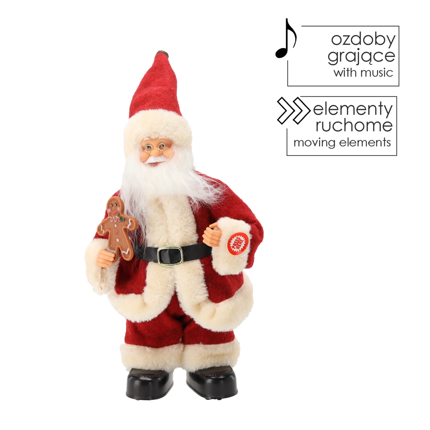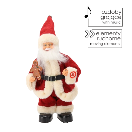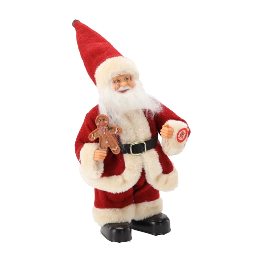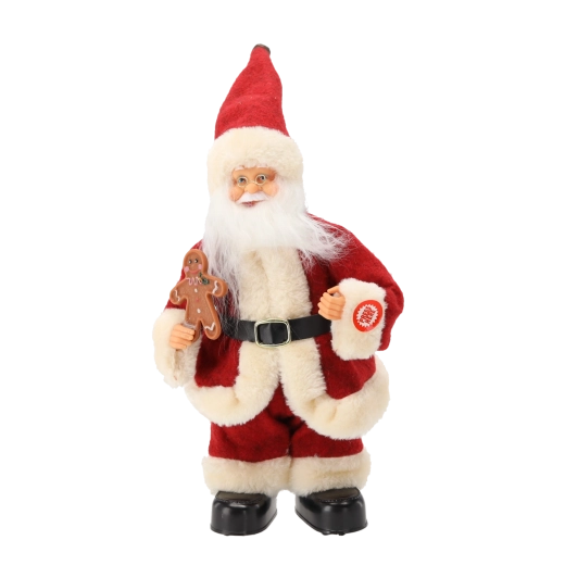 Figurka je propracovaná do detailu: bohatý bílý vous, měkké lemování kožíškem, černý pásek a boty, v ruce perníček – vše přispívá k autentickému dojmu. Díky kompaktním rozměrům 30 cm se hodí na stůl, komodu, recepci nebo do obchodní výlohy.