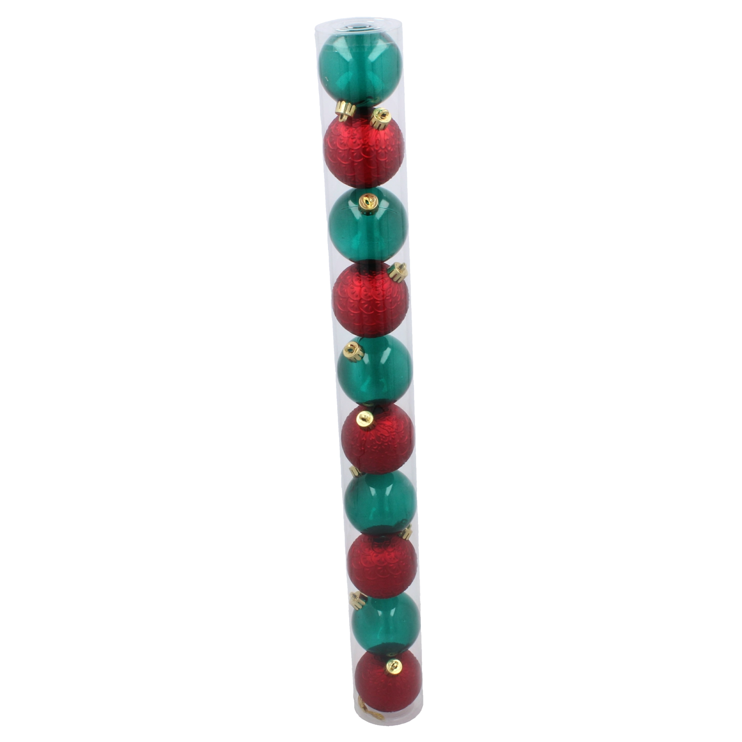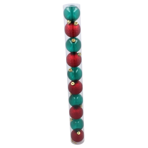Tato stylová sada 10 bombiček je ideální pro zdobení vánočního stromku, věnců, girland i dalších svátečních aranžmá. Harmonická kombinace intenzivní červené a hluboké zelené vytváří teplou, slavnostní atmosféru, která potěší celou rodinu i hosty.