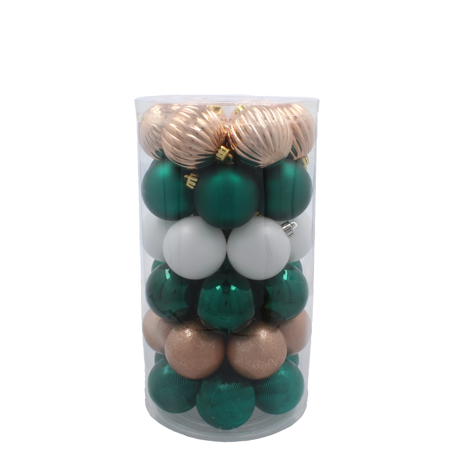 Dopřejte svému domovu elegantní sváteční šmrnc. Tato ucelená sada vánočních koulí v trendových odstínech kombinuje jemnou šampaňskou, klasickou zelenou a čistě bílou pro dokonale vyvážený vzhled. Různé povrchové úpravy – lesk, mat, žebrování a jemný třpyt – vytvářejí hloubku a odlesky, které podtrhnou kouzlo Vánoc.