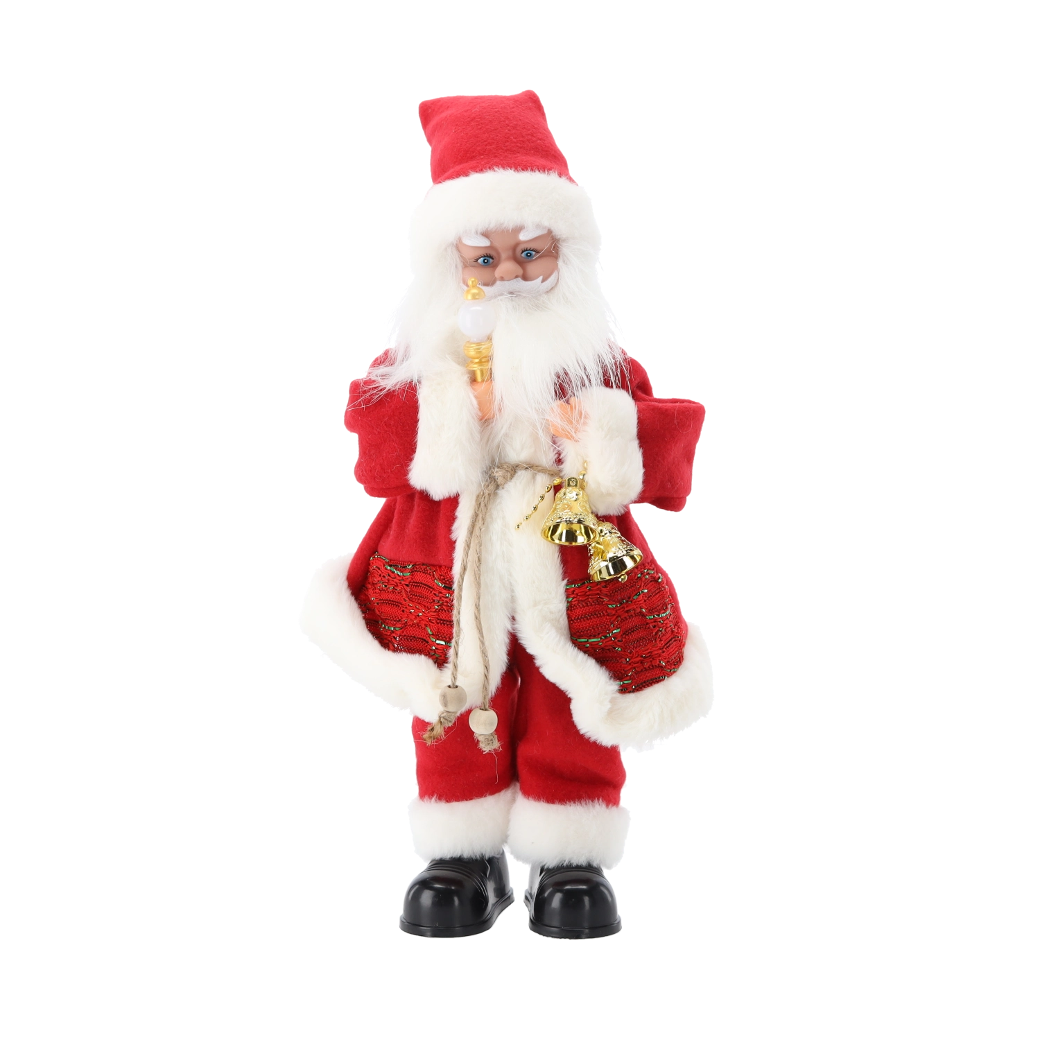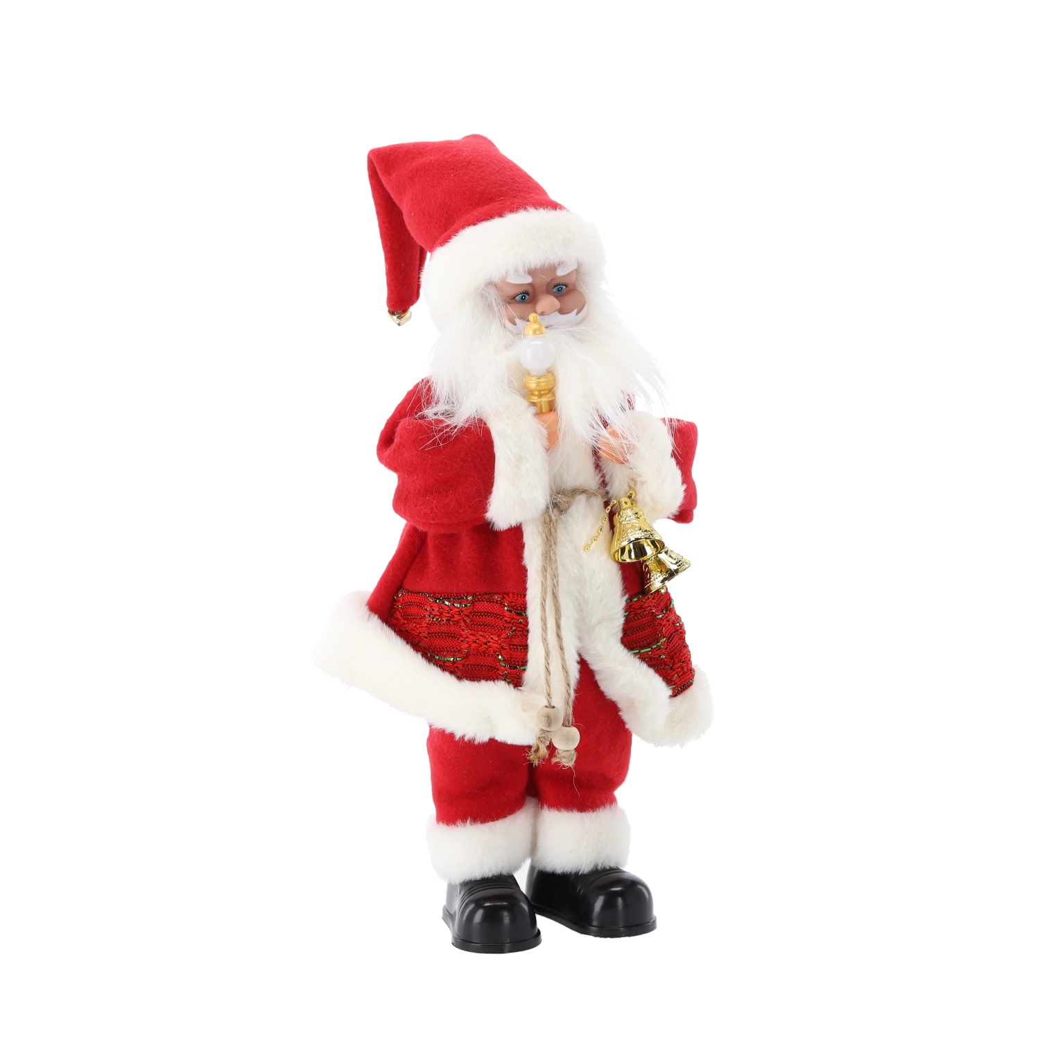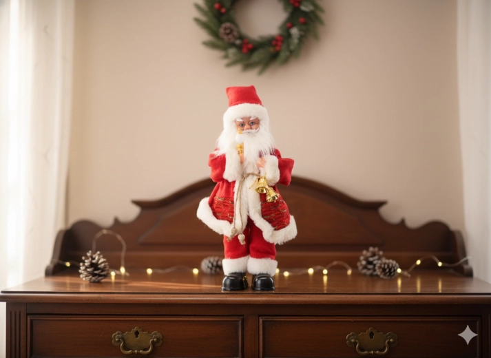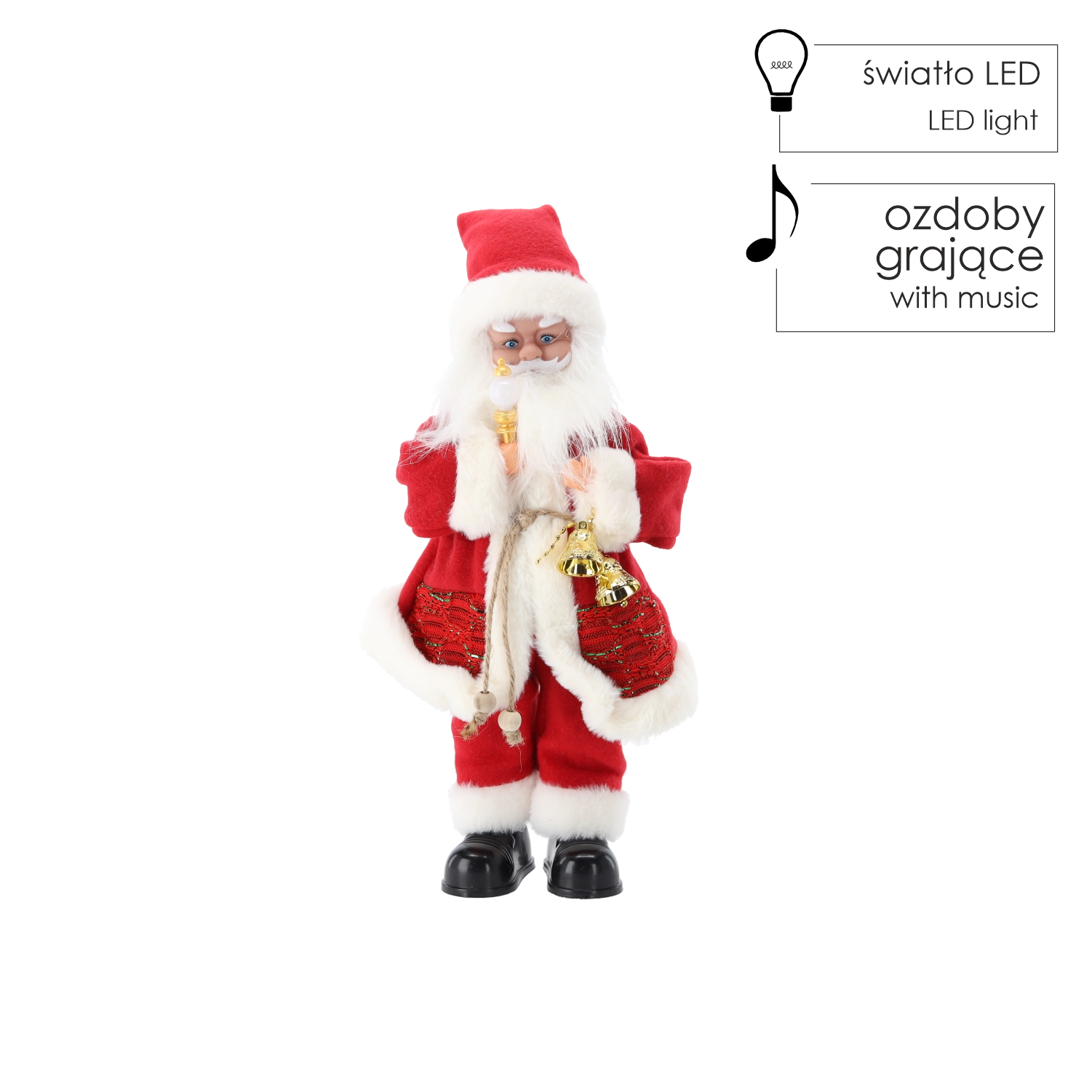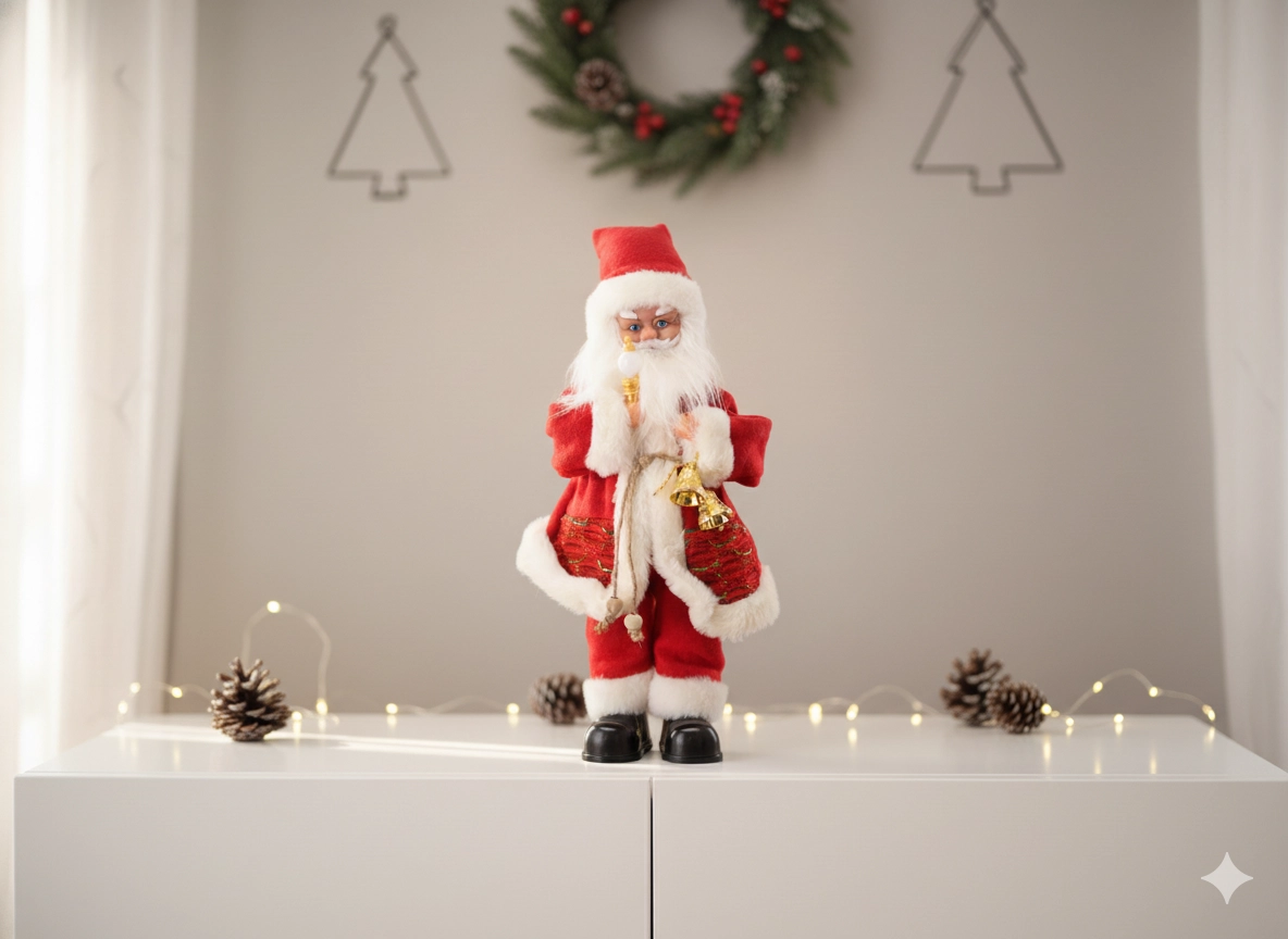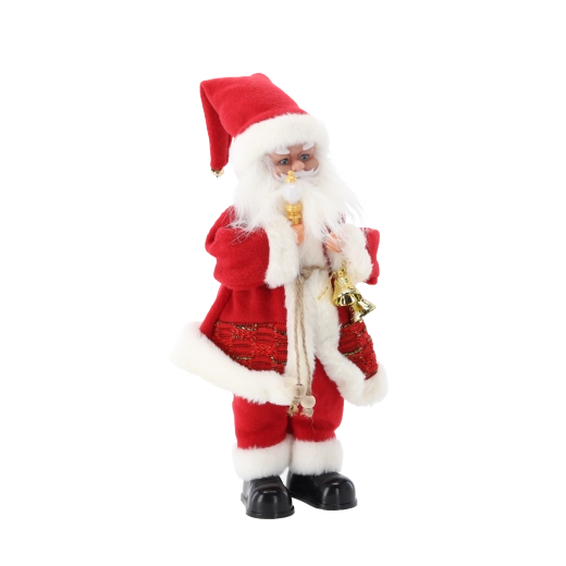 Tato elegantní vánoční dekorace spojuje tradiční motiv SANTY s moderními prvky – LED osvětlením a hudební funkcí. Bohaté detaily, hebký kostým a doplňky jako svíčka či zvoneček dodají interiéru hřejivý, sváteční nádech.