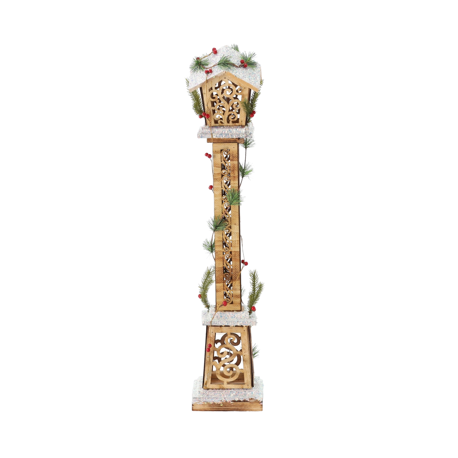 Kvalitní dřevo doplňuje umělé jehličí, červené bobule a sněhový poprašek. Celek působí autenticky a elegantně v každém vánočním aranžmá.