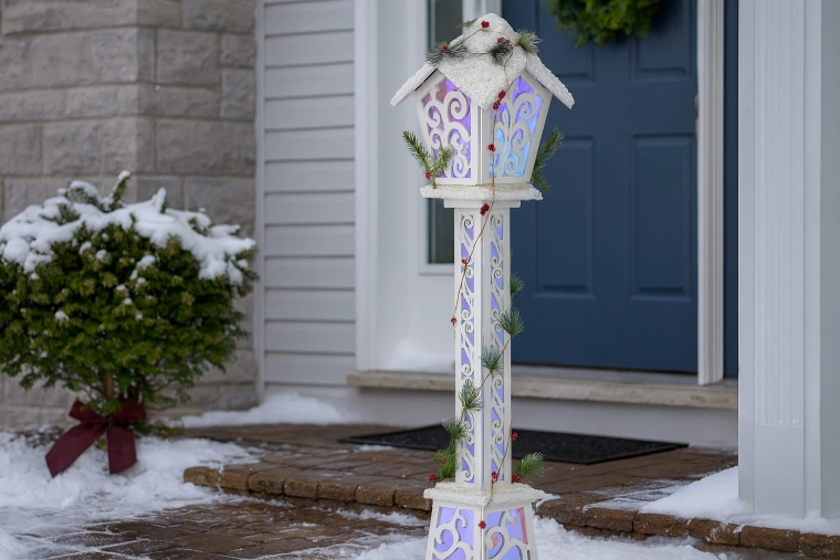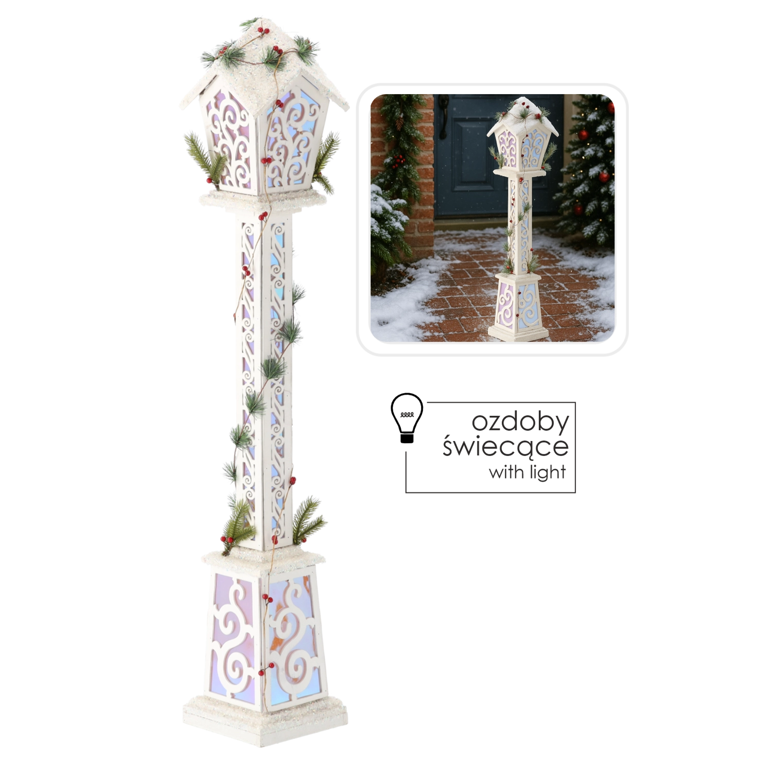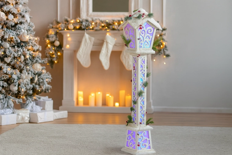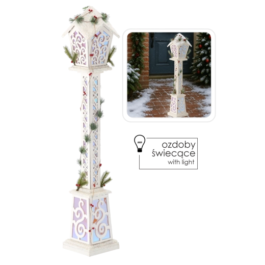 Tato vysoká vánoční lucerna zaujme čistě bílým designem a jemně prosvětlenými ornamentálními panely, které po rozsvícení vytvářejí působivou hru světla. Díky LED technologii svítí úsporně a bezpečně, bez zahřívání a s dlouhou výdrží.