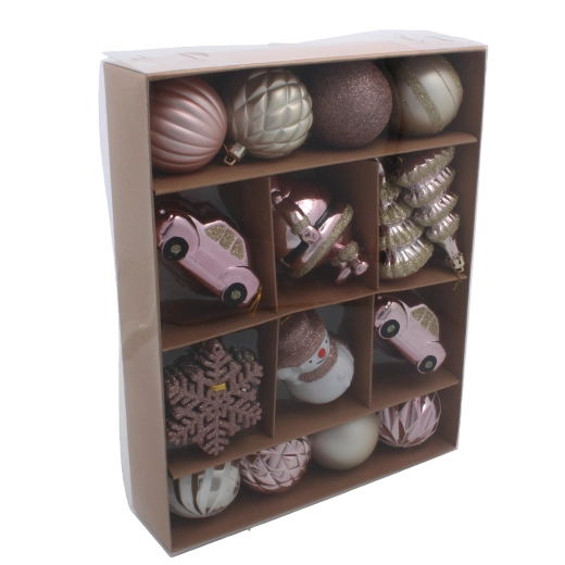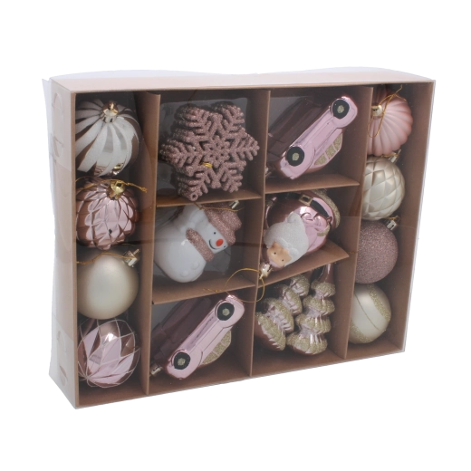 Sada obsahuje pečlivě vybrané ozdoby s různými povrchy a tvary, které dodají vašemu stromku hloubku a třpyt. Růžové a modré tóny skvěle fungují v moderních, severských i klasických interiérech a snadno je zkombinujete s dalšími dekoracemi.