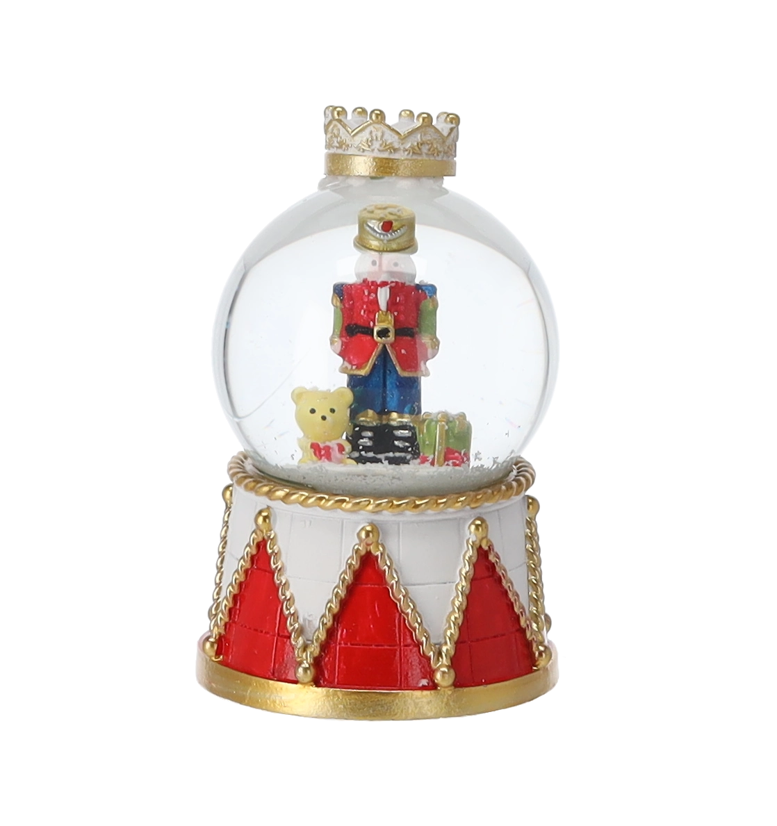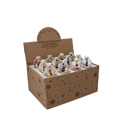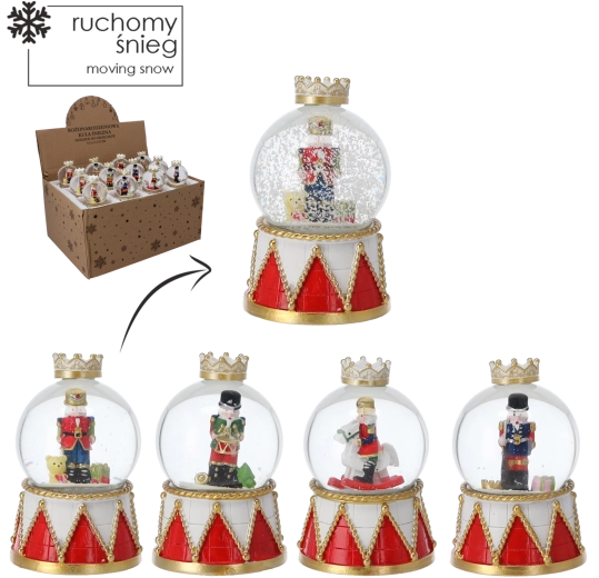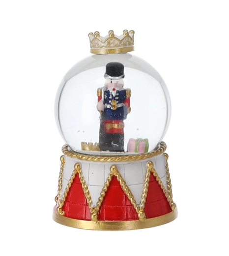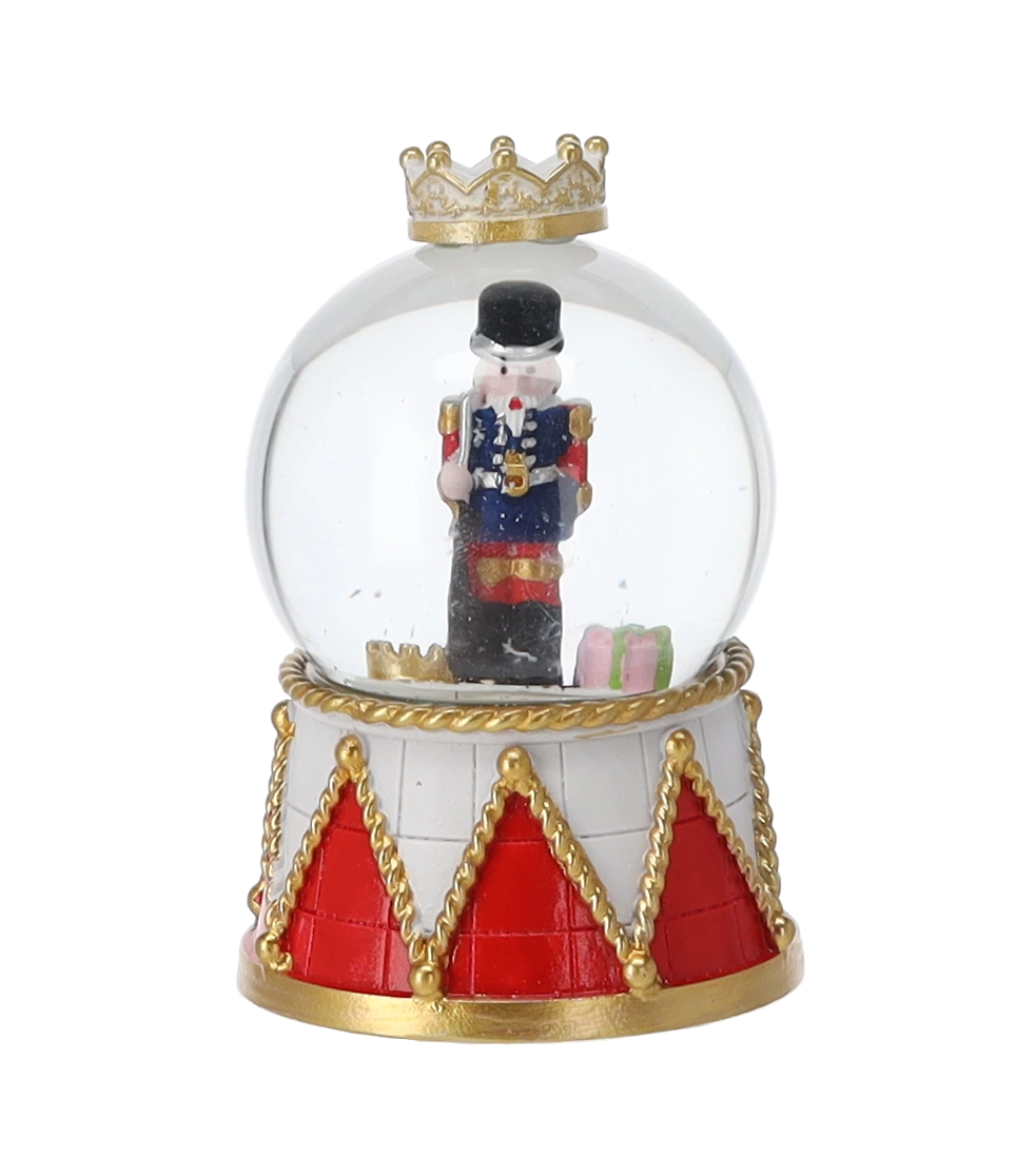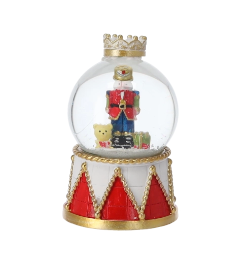 Každý kus zdobí čirá skleněná kopule a dekorativní podstavec v červeno‑zlatém bubínkovém designu s korunou. Kompaktní rozměry umožní umístění na konferenční stolek, poličku i sváteční stůl. Díky mixu motivů louskáčků snadno sladíte kouli s ostatními ozdobami.
