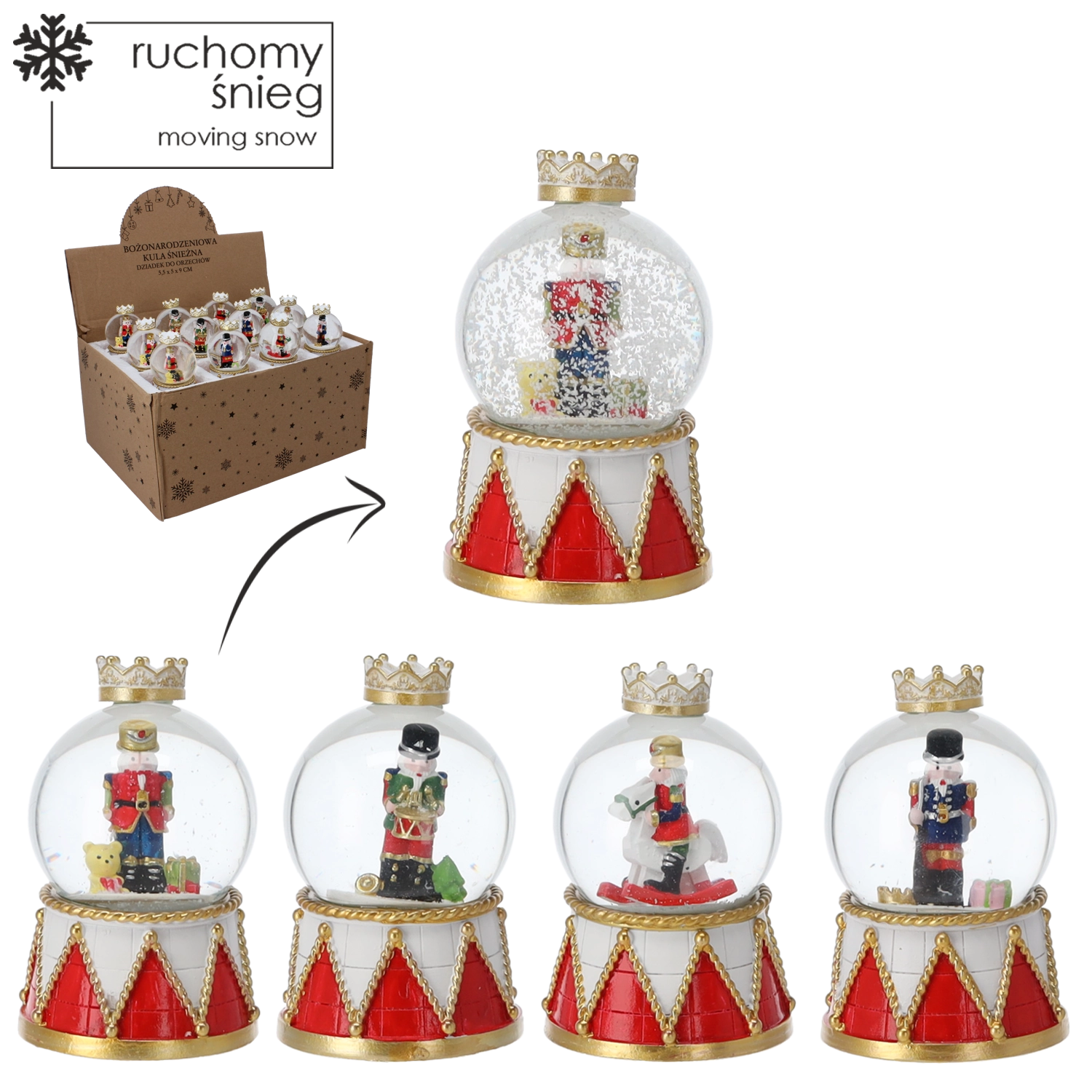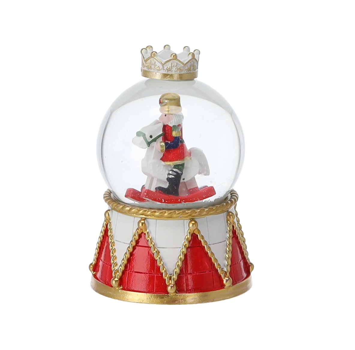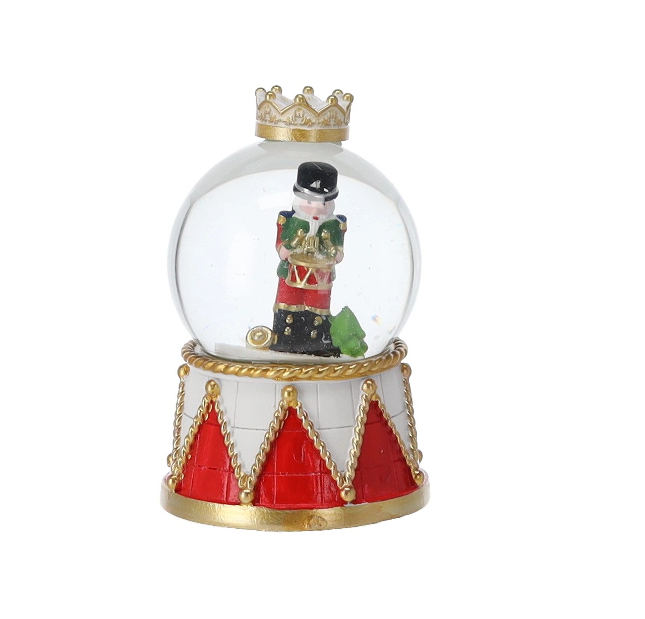 Každý kus zdobí čirá skleněná kopule a dekorativní podstavec v červeno‑zlatém bubínkovém designu s korunou. Kompaktní rozměry umožní umístění na konferenční stolek, poličku i sváteční stůl. Díky mixu motivů louskáčků snadno sladíte kouli s ostatními ozdobami.