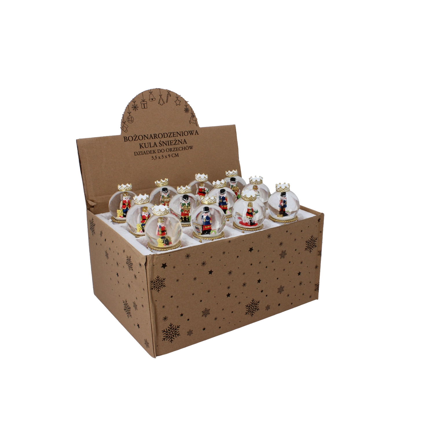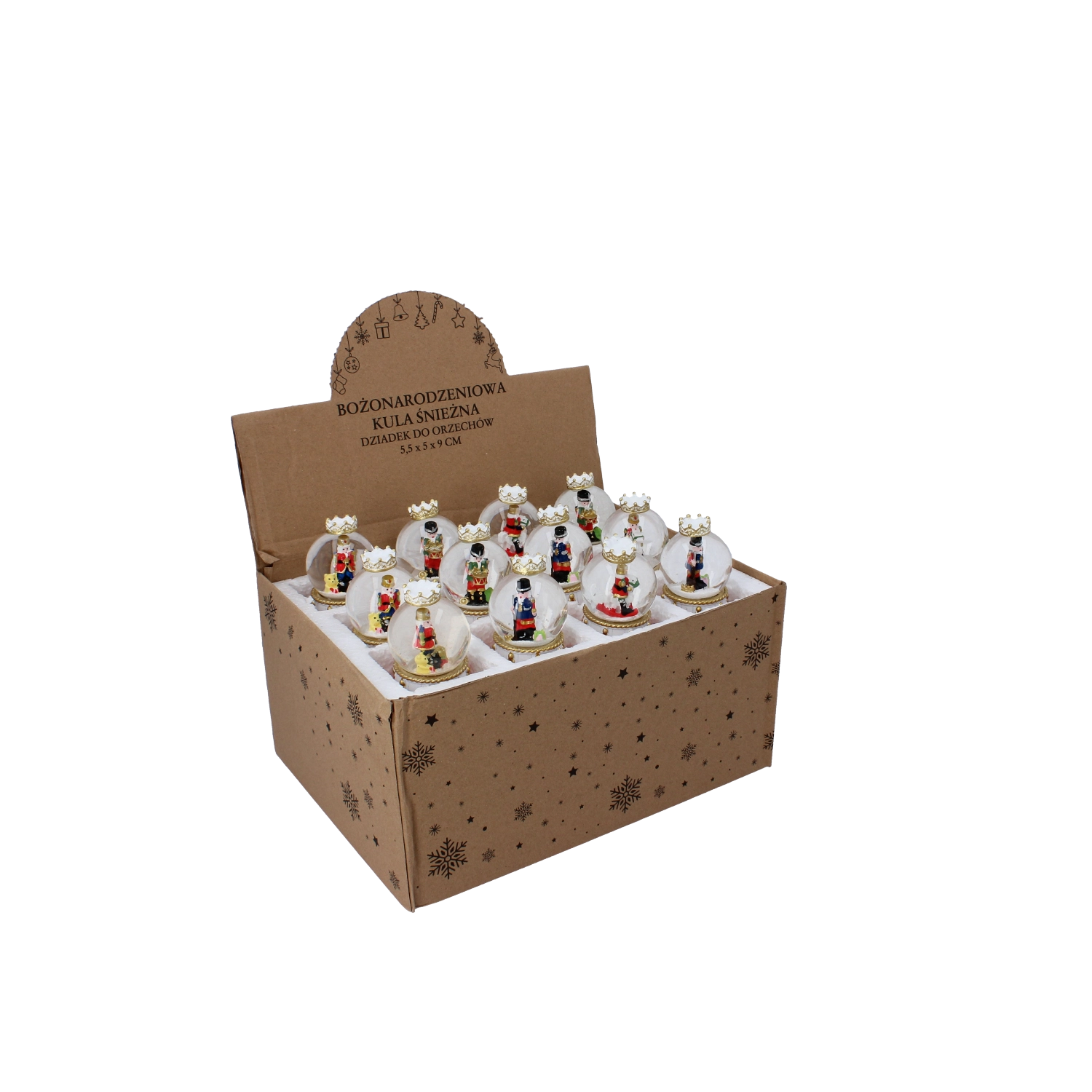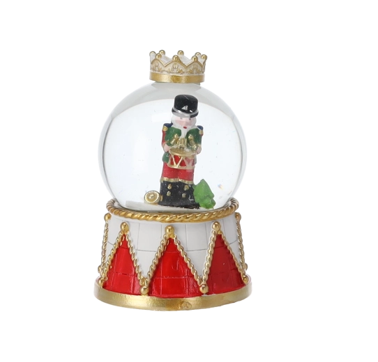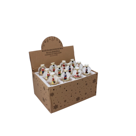 Kouzelná vánoční dekorace, která vnese do domova tradici a lesk. Po zatřesení se v kouli roztočí třpytivý „sníh“ kolem ikonické postavičky louskáčka. Ideální jako dárek i elegantní ozdoba na komodu či poličku. Skleněná dóma, bohatě zdobený podstavec ve stylu bubínku a mix různých motivů pro jedinečné sváteční aranžmá.