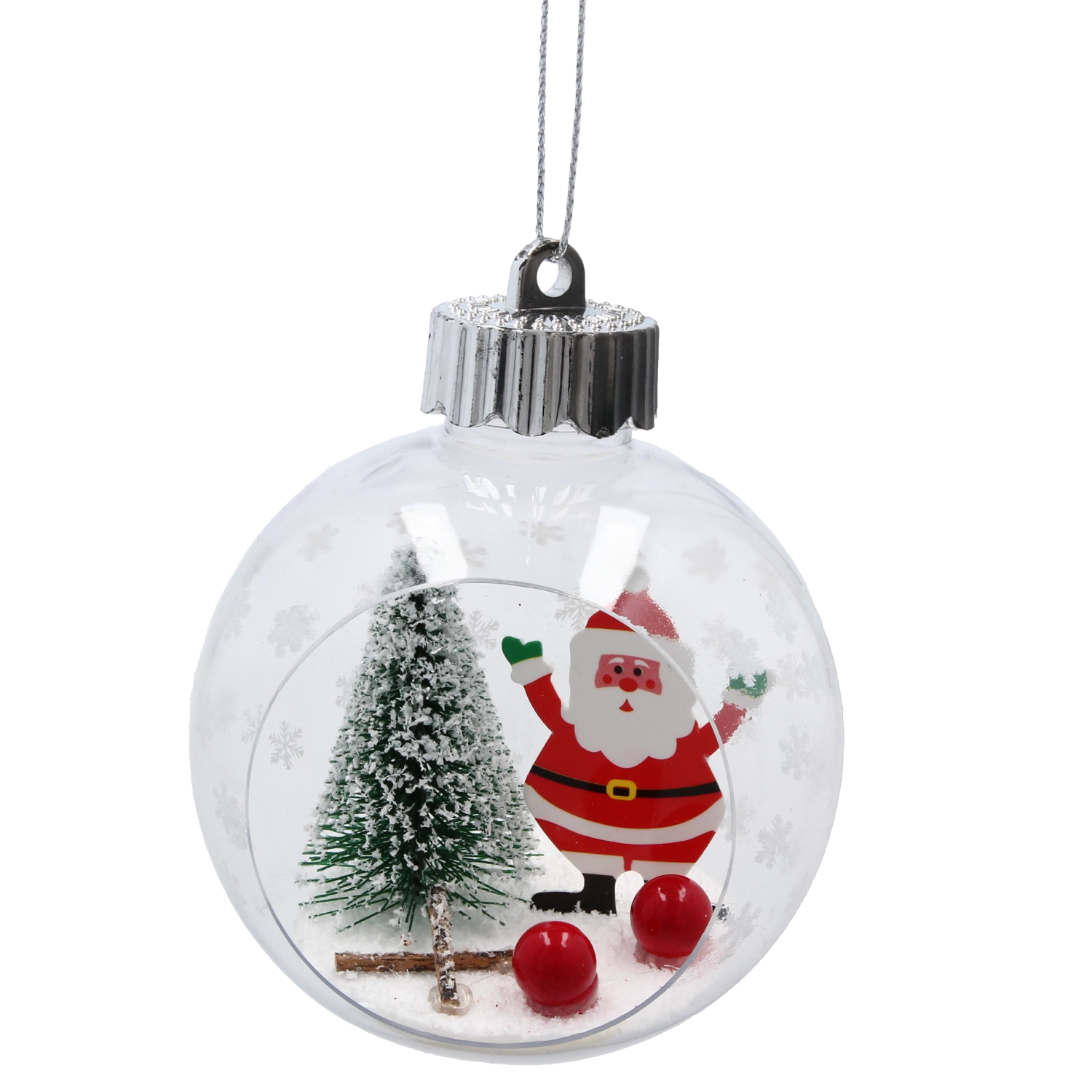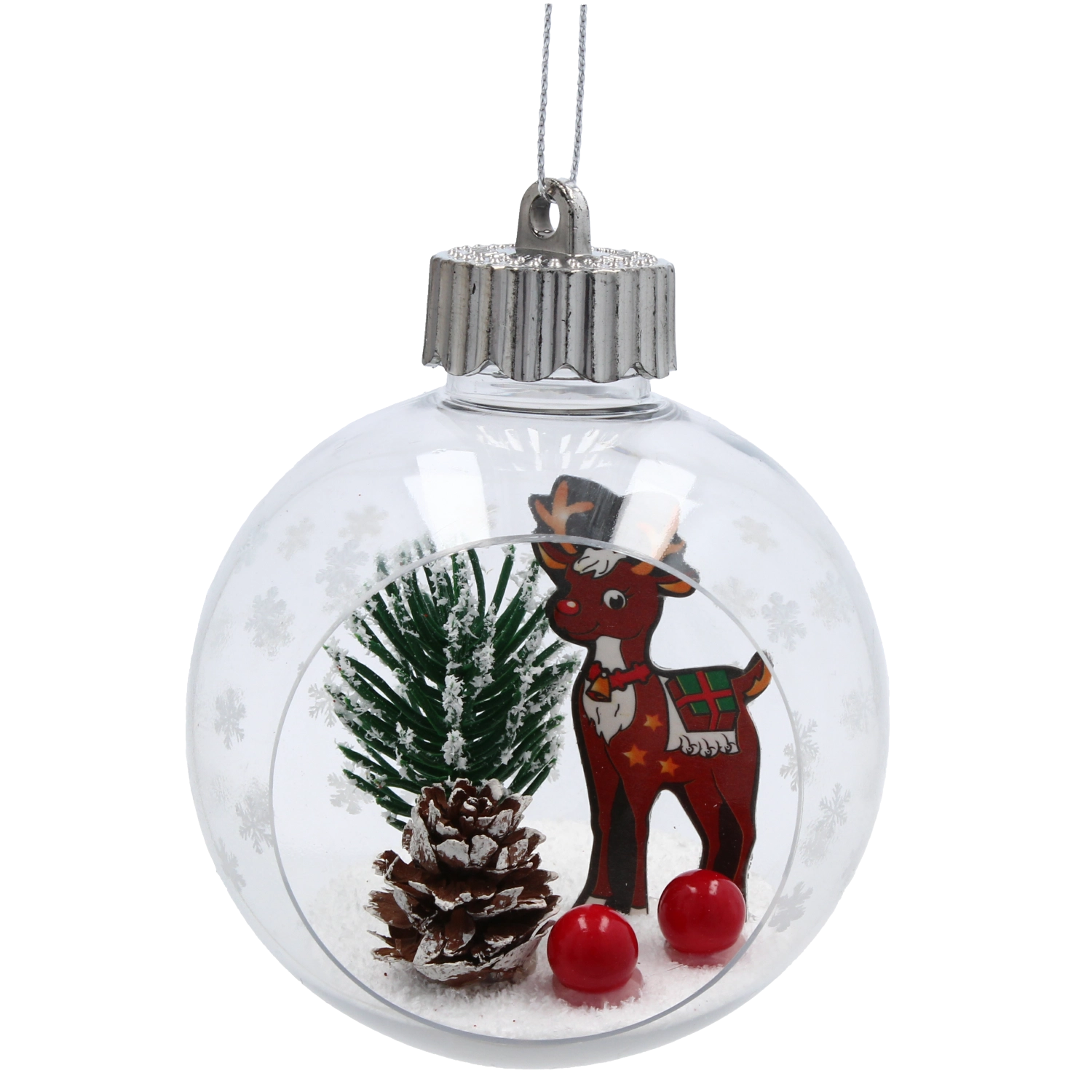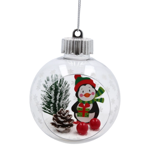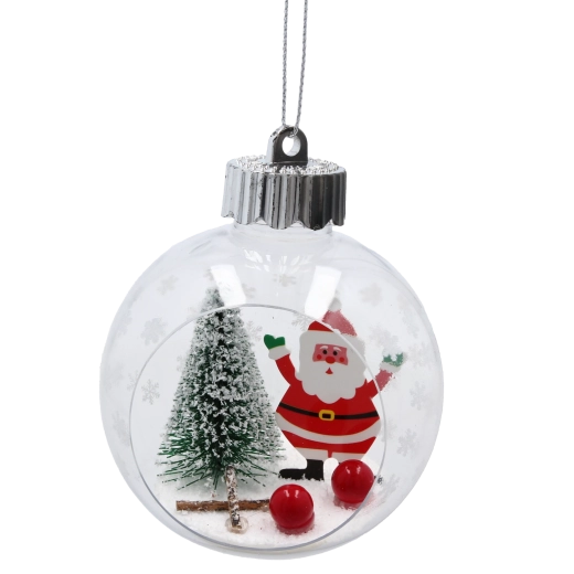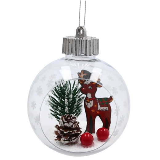 Tato vánoční ozdoba ve tvaru čiré baňky se stříbrným závěsem v sobě ukrývá drobnou zimní scenérii – sněhem poprášený stromeček, šišku, červené bobule a postavičku podle vybraného motivu. Kombinace skla a lehkého plastu zajišťuje nízkou hmotnost, bezpečné zavěšení a dlouhou životnost. Každý kousek je precizně zpracovaný s důrazem na detail, aby vytvářel autentickou sváteční náladu.