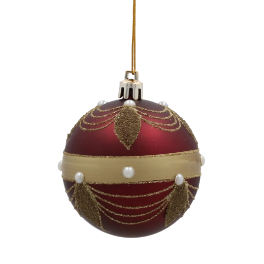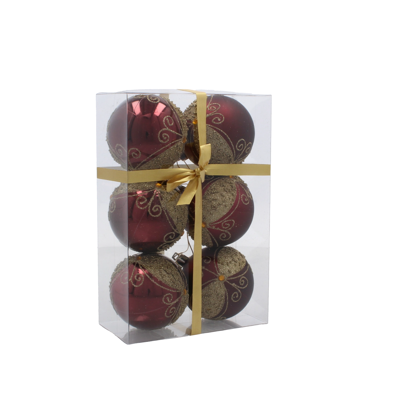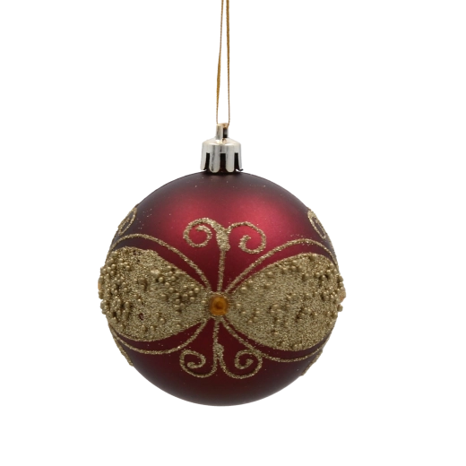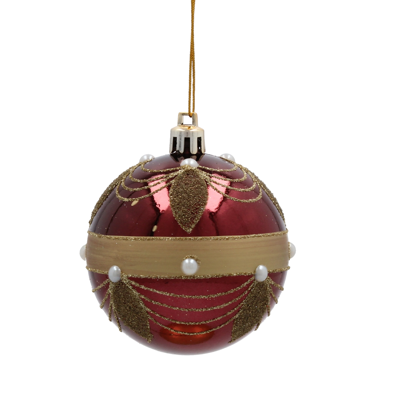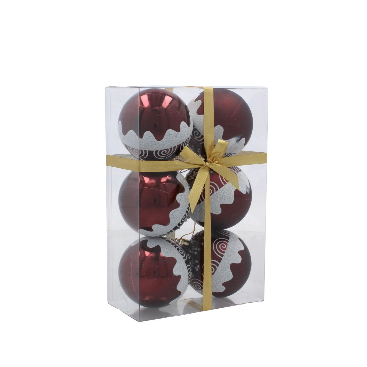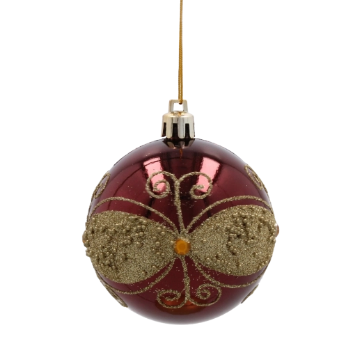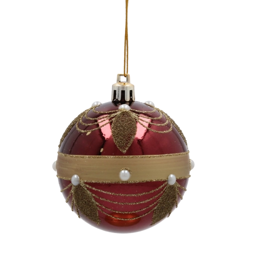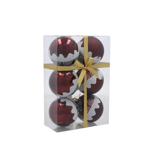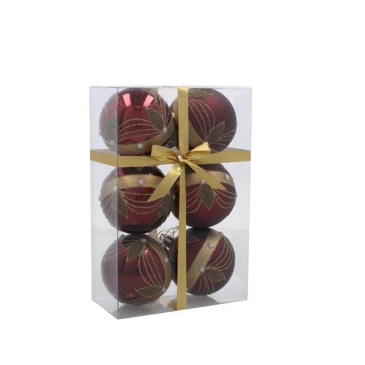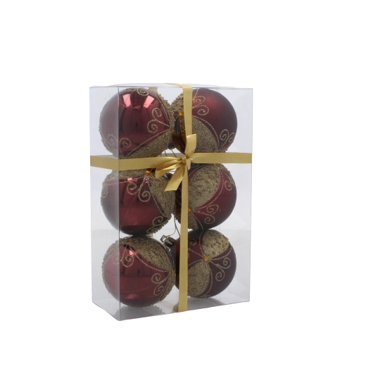 Dodejte svému domovu sváteční třpyt se sadou šesti ozdob v hluboké burgundské barvě. Každá koule o průměru 7 cm je zdobena zlatými liniemi, listy a bílými perličkami pro elegantní, glamour vzhled. Vyrobené z nerozbitného plastu jsou bezpečné pro děti i domácí mazlíčky a díky šňůrkám pro snadné zavěšení je využijete na stromku i v dalších svátečních aranžmá.