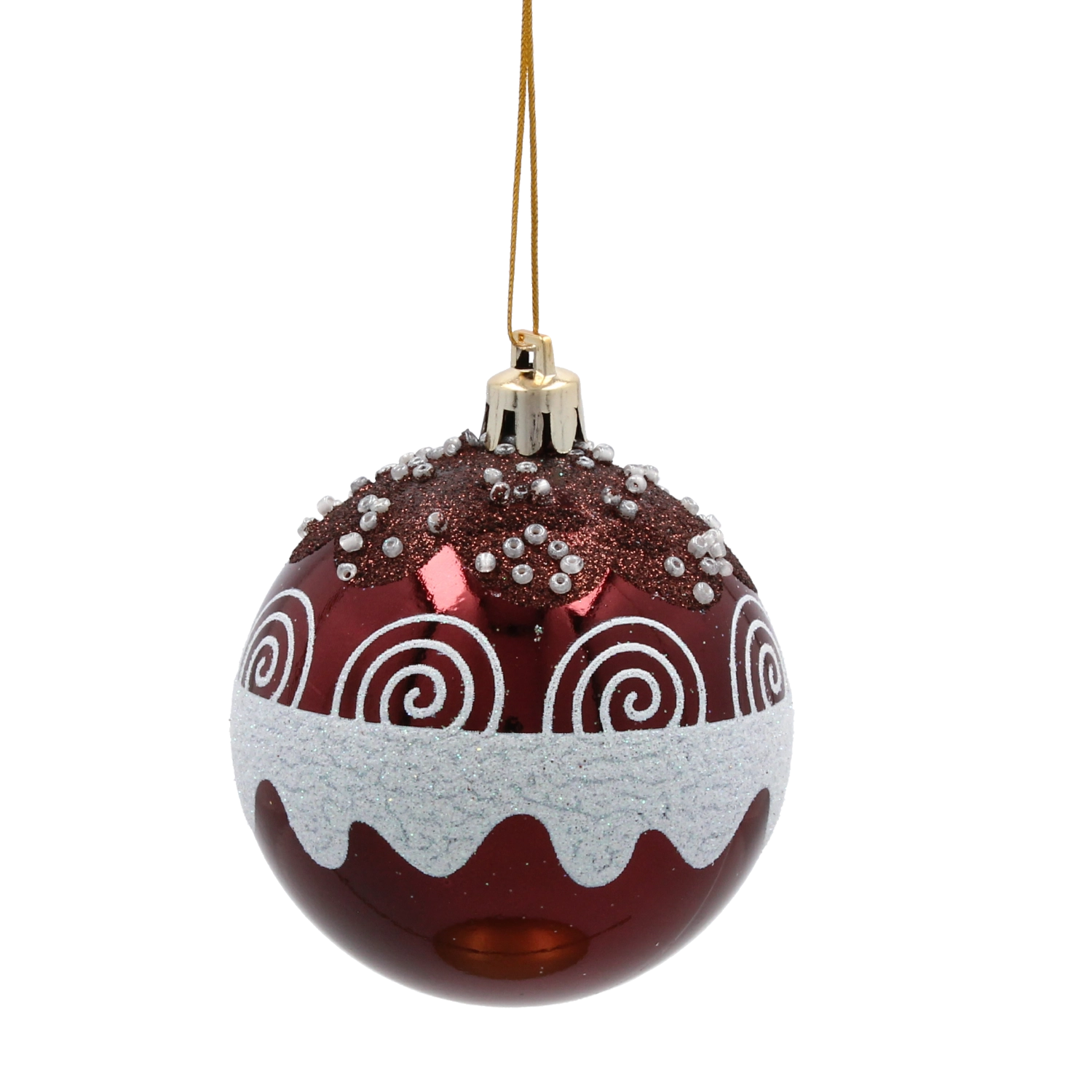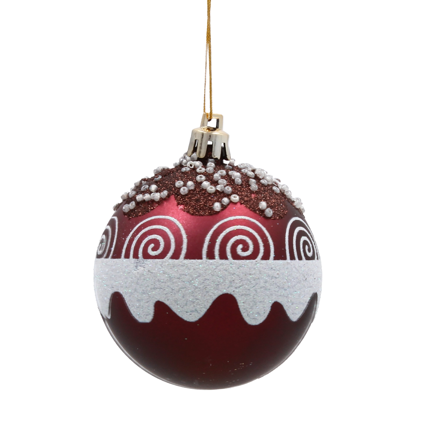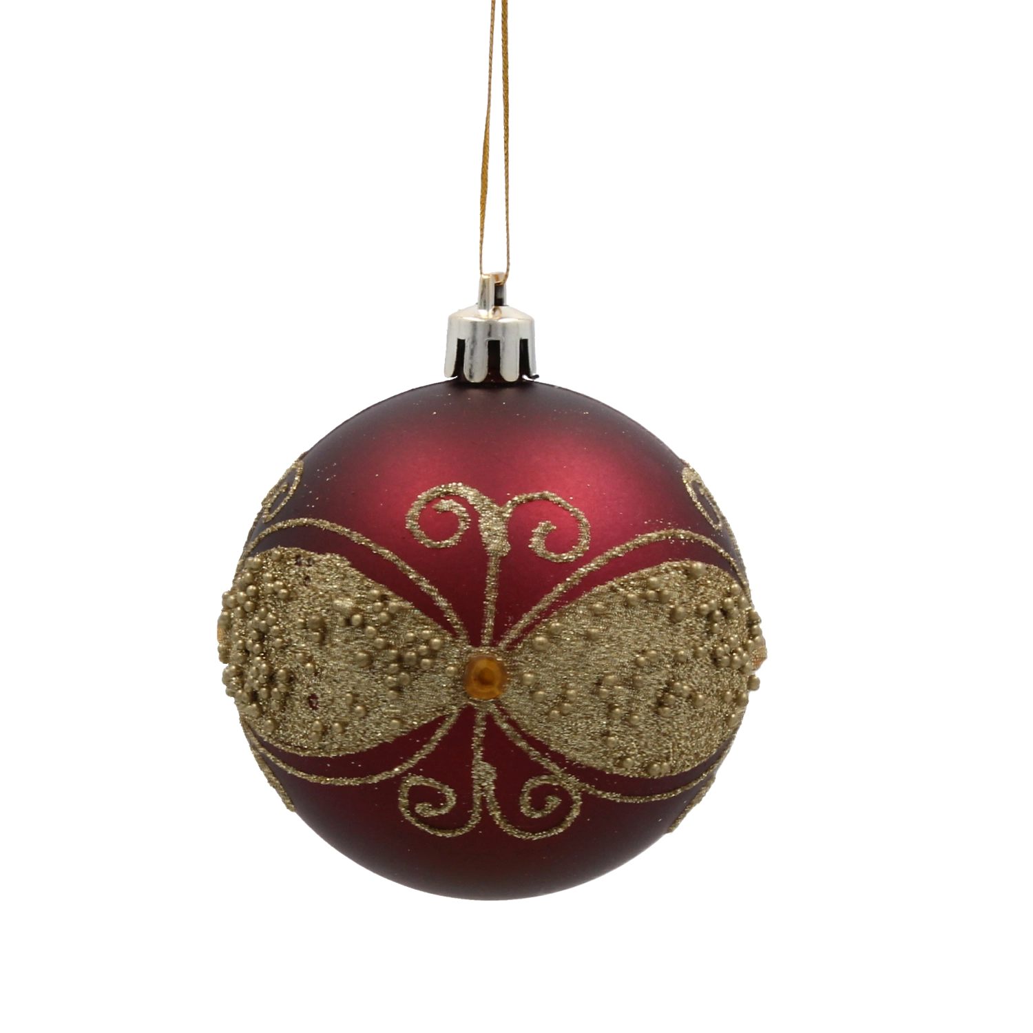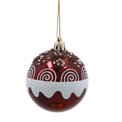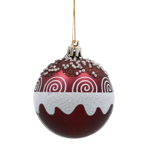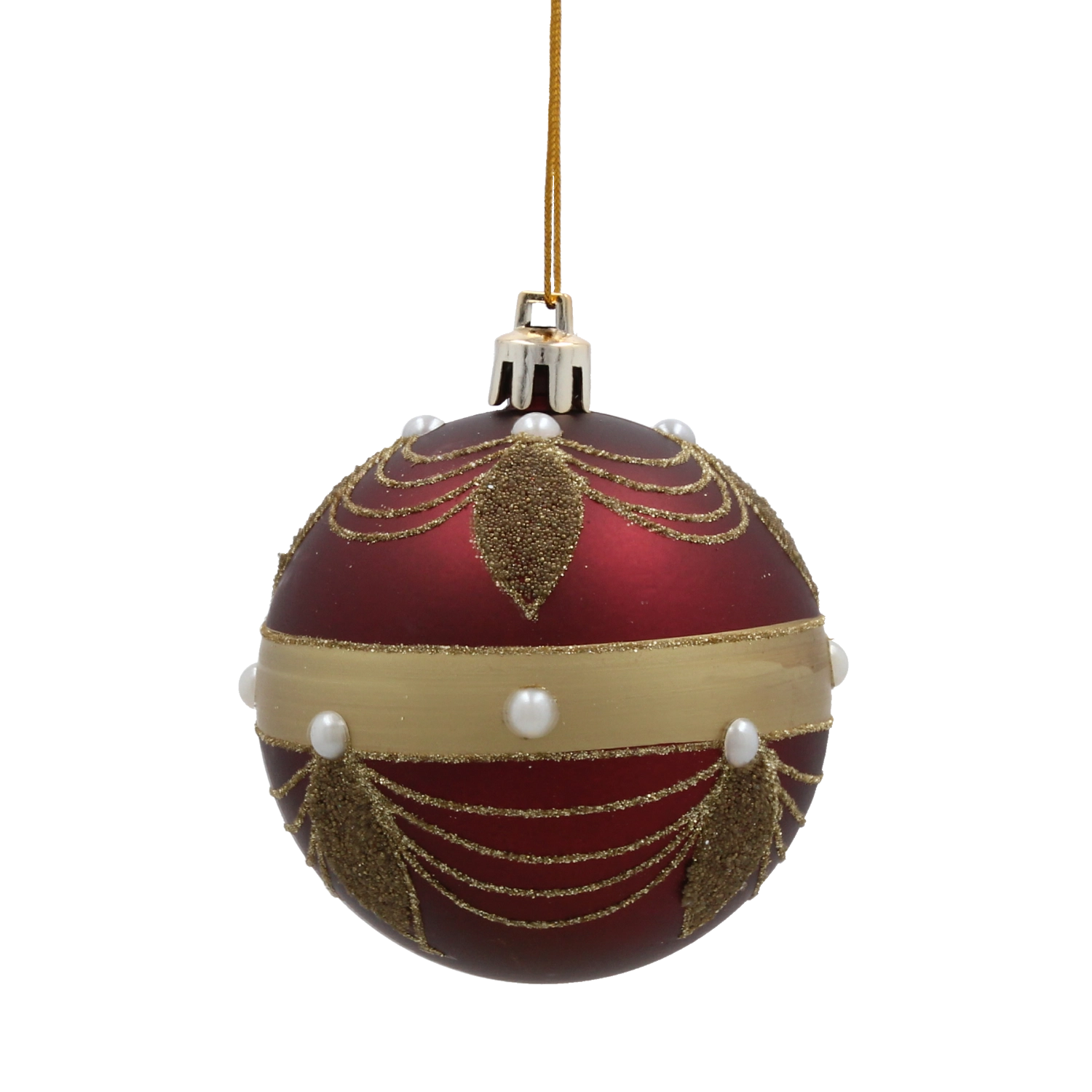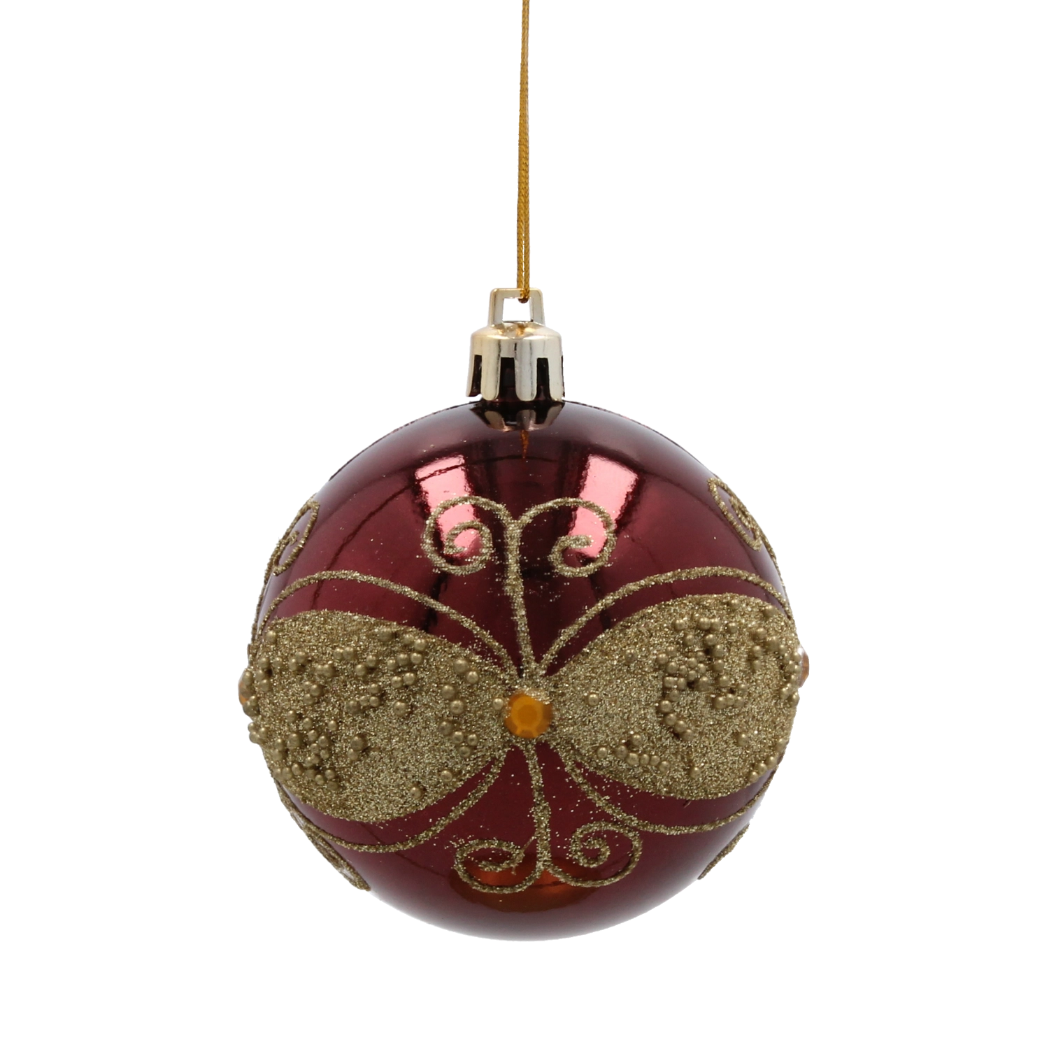 Dodejte svému domovu sváteční třpyt se sadou šesti ozdob v hluboké burgundské barvě. Každá koule o průměru 7 cm je zdobena zlatými liniemi, listy a bílými perličkami pro elegantní, glamour vzhled. Vyrobené z nerozbitného plastu jsou bezpečné pro děti i domácí mazlíčky a díky šňůrkám pro snadné zavěšení je využijete na stromku i v dalších svátečních aranžmá.