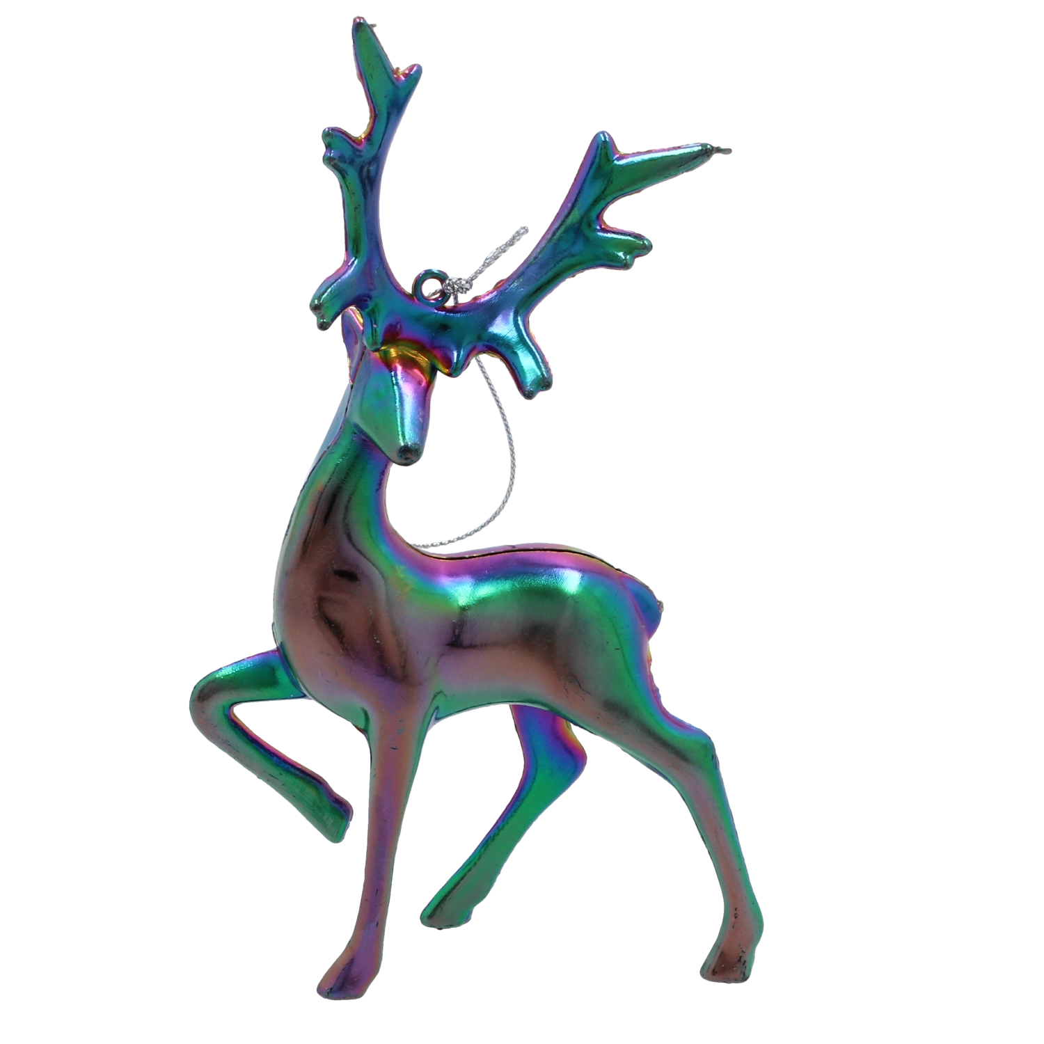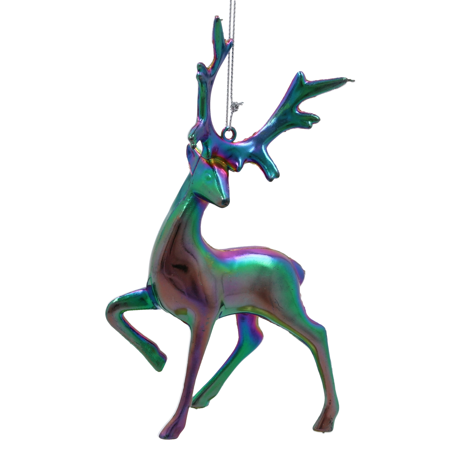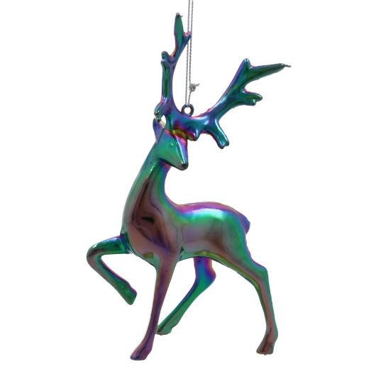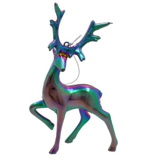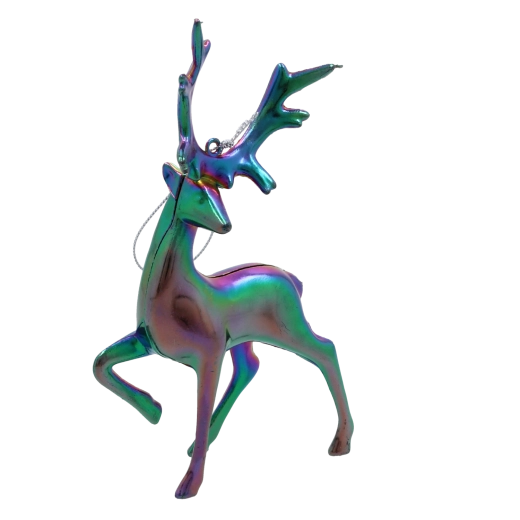Tato designová ozdoba renifera se vyznačuje hladkým, lesklým povrchem s iridescentním – „benzínovým“ efektem, který se mění podle dopadu světla od fialové přes zelenou až po modré tóny. Díky proměnlivému odlesku působí na stromku jako výrazný, ale vkusný akcent.