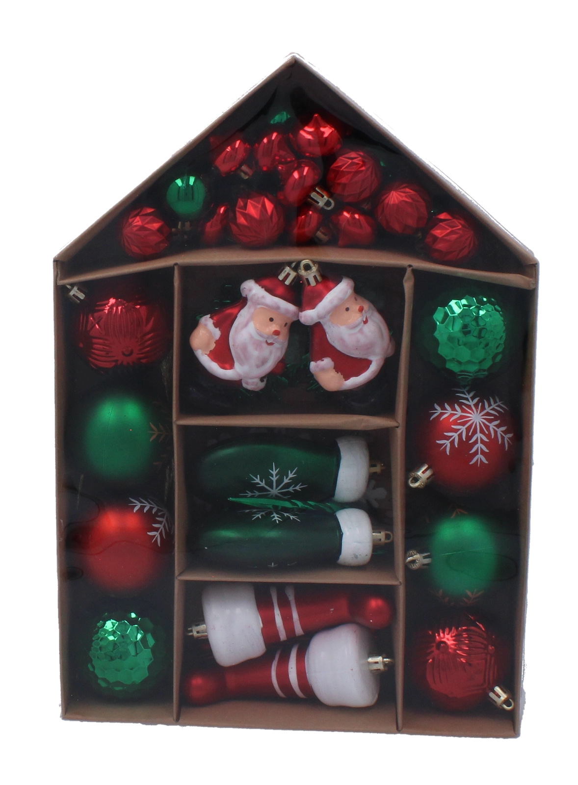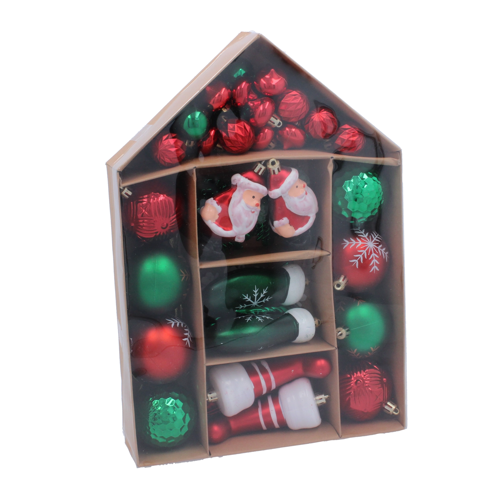 Ozdoby jsou vyrobeny z kvalitního, nerozbitného plastu, takže se skvěle hodí do domácností s dětmi i mazlíčky. Lehká konstrukce šetří větve a díky závěsným očkům je zdobení rychlé a pohodlné. Průhledná, domečková krabice s rukojetí udrží vše přehledně roztříděné a usnadní přenášení i uskladnění po Vánocích.