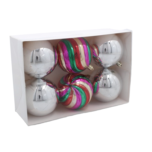 Elegantní sada 6 vánočních baněk o průměru 8 cm dodá vaší výzdobě styl a lesk. Každá koule má unikátní vzor – od zrcadlově lesklé stříbrné po barevné spirály – pro harmonickou, ale pestrou kompozici. Díky neroztříštitelnému plastu jsou bezpečné a odolné, lehké na zavěšení a ideální pro domovy s dětmi či domácími mazlíčky.
