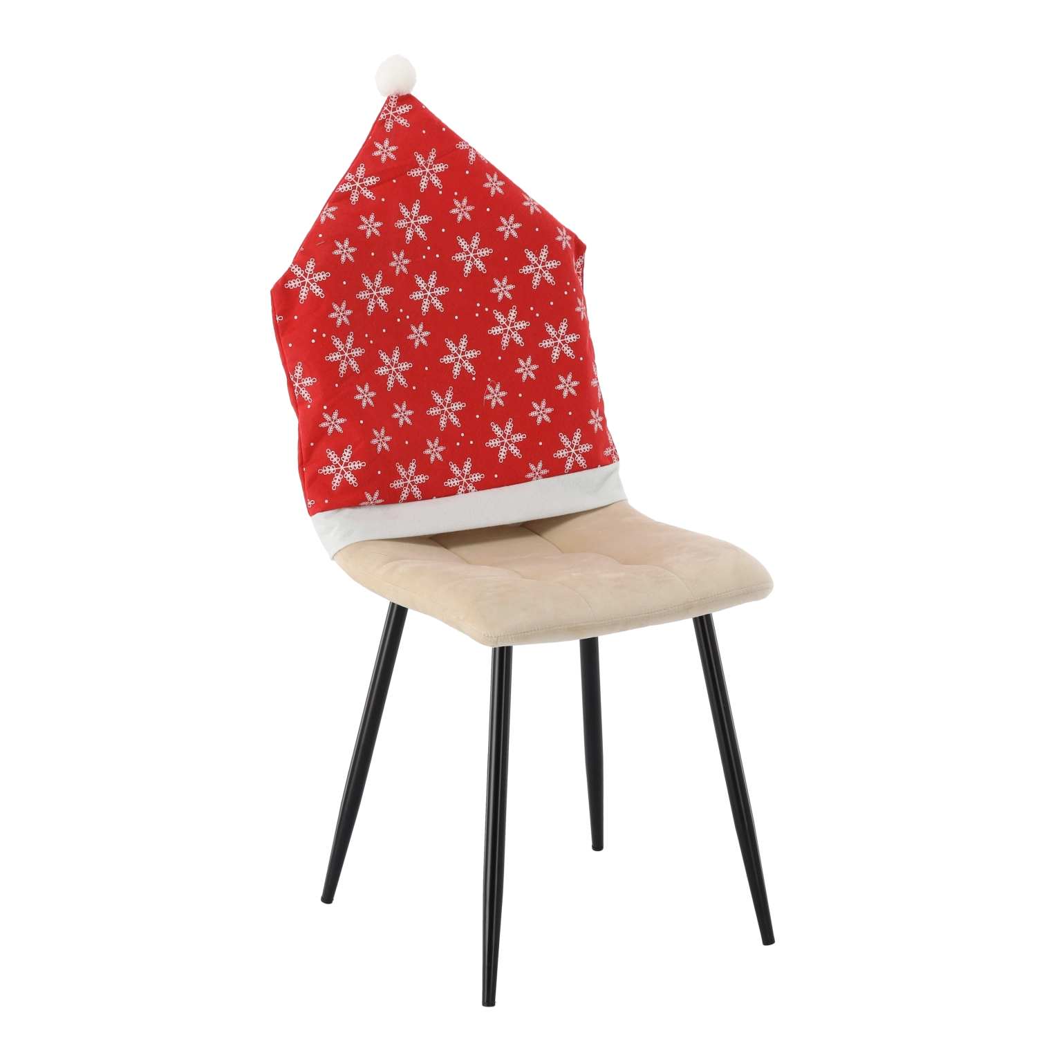 Červený potah s bílým lemem, bambulkou a motivem vloček dodá židlím kouzelný vánoční vzhled během pár vteřin.