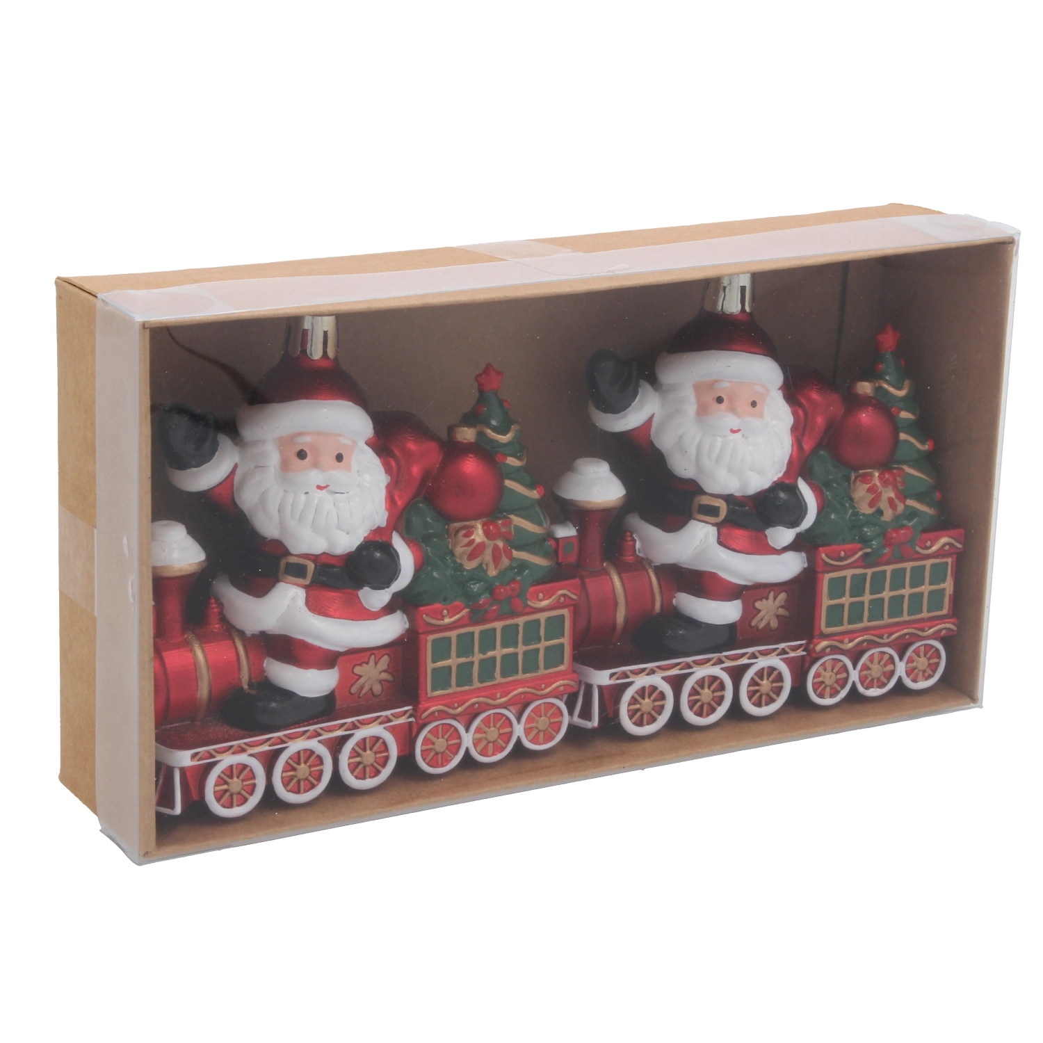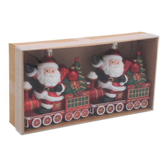 Objevte půvabný set dvou vánočních ozdob ve tvaru vláčku s Mikulášem, které přinesou do interiéru hřejivou sváteční atmosféru. Díky kombinaci červené, zelené a zlaté barvy se ozdoby snadno sladí s tradiční i moderní výzdobou a stanou se výrazným prvkem vašeho stromečku.
