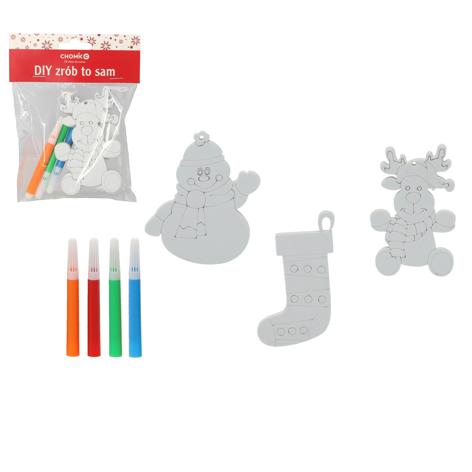 - 3 závěsné ozdoby (sněhulák, sob, punčocha) + 4 barevné fixy