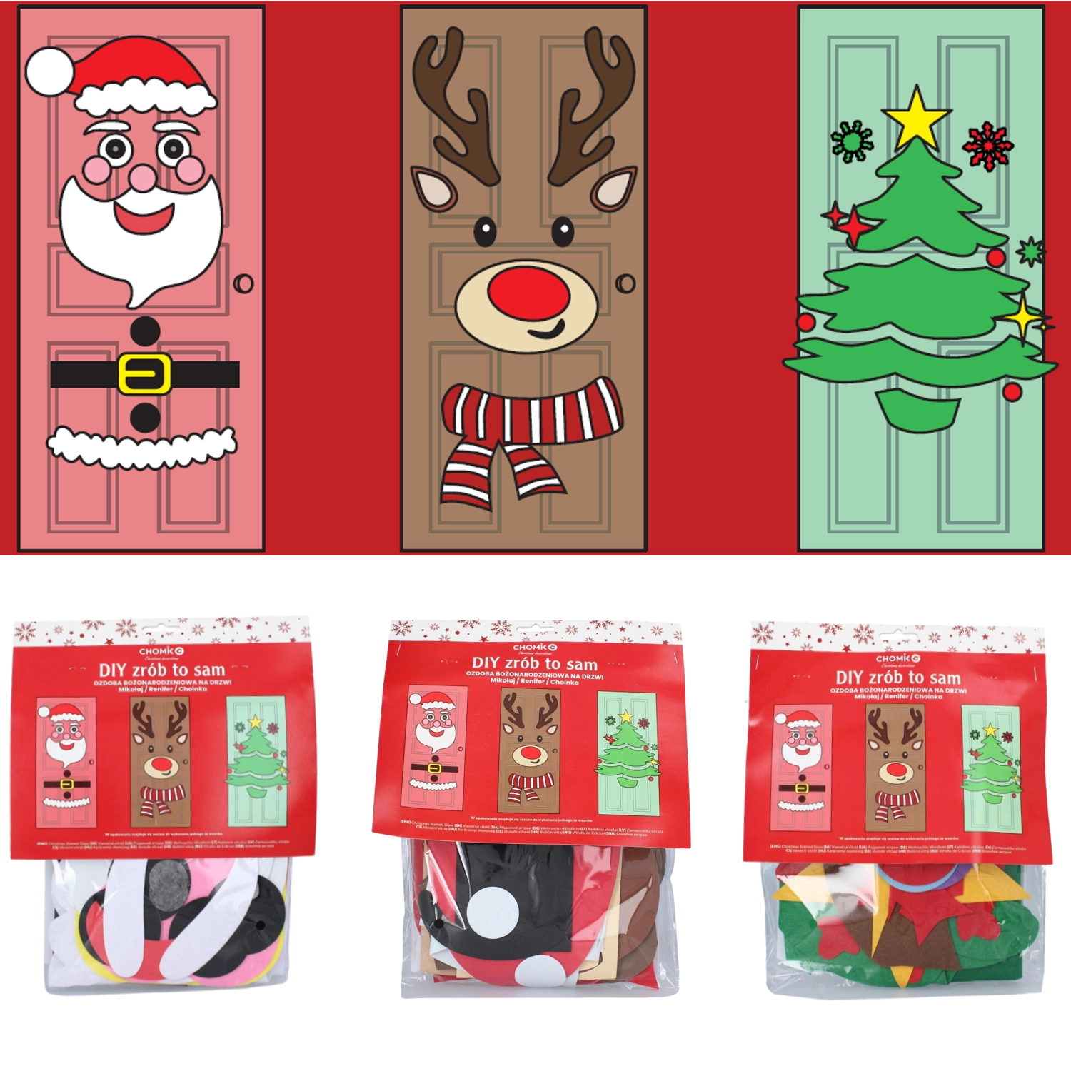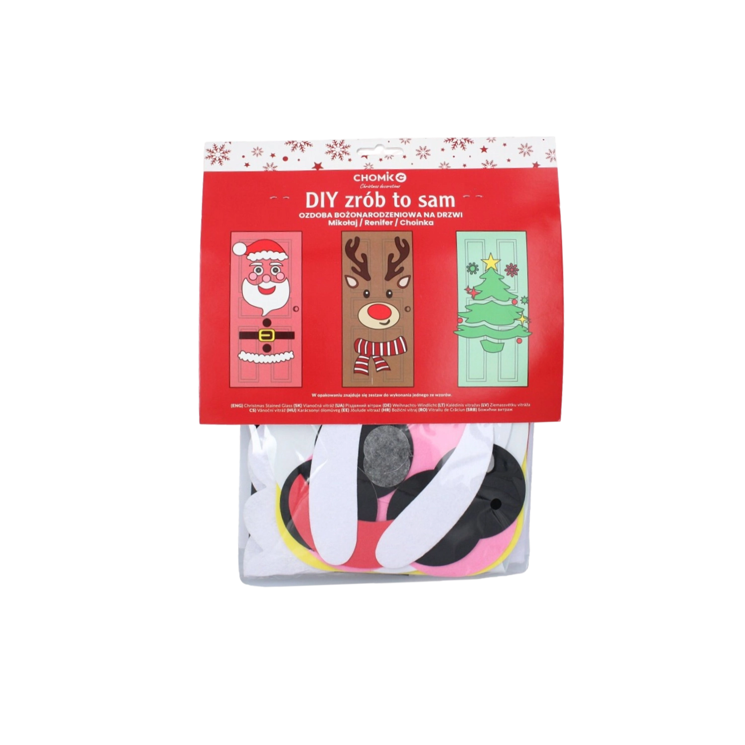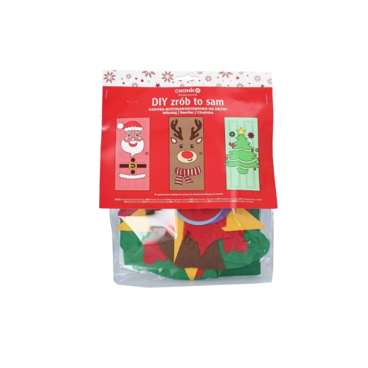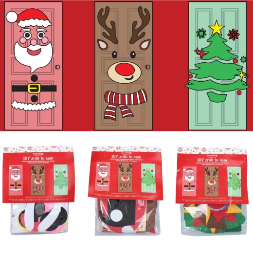Tato sváteční dekorace promění jakékoli interiérové či vstupní dveře v působivý vánoční prvek. Měkké filcové a samolepicí části snadno připevníte a kdykoli přeuspořádáte – ideální pro děti i dospělé. Vyberte si z motivů vánočního stromečku, SANTY nebo soba a vytvořte si originální výzdobu přesně podle sebe.