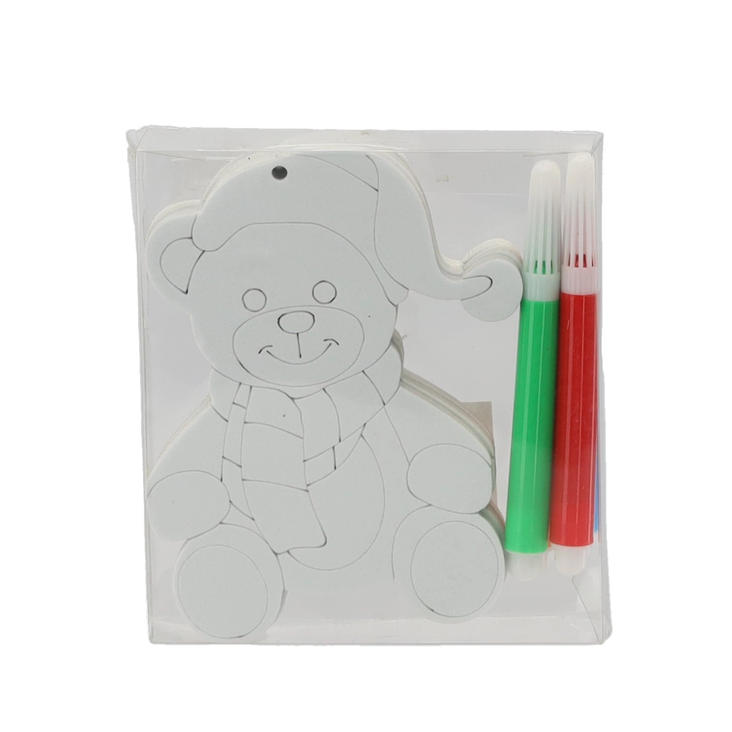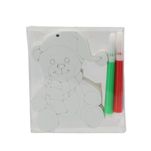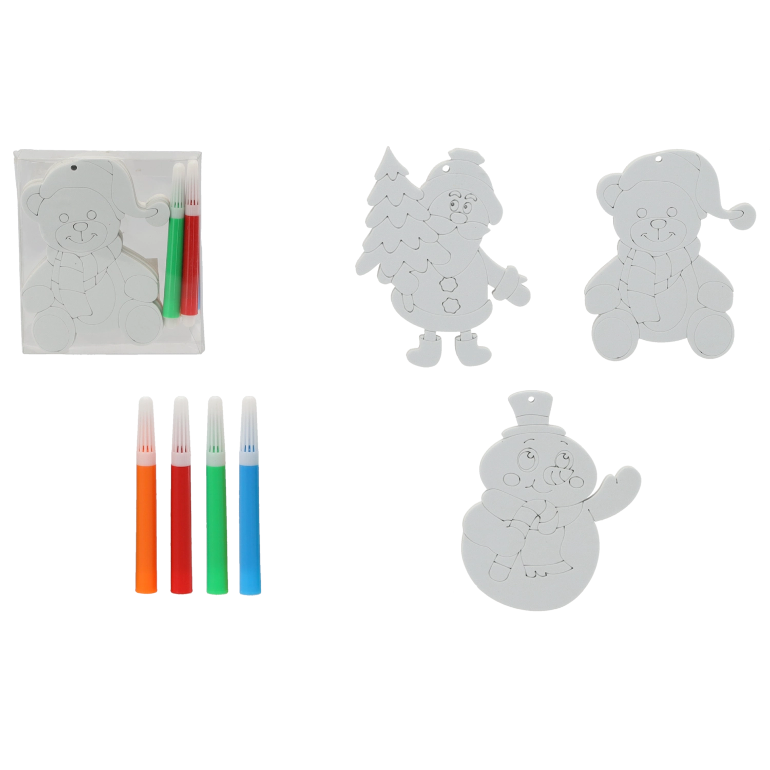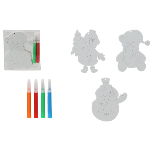 - 3 závěsné ozdoby (sněhulák, medvídek, Santa) + 4 barevné fixy