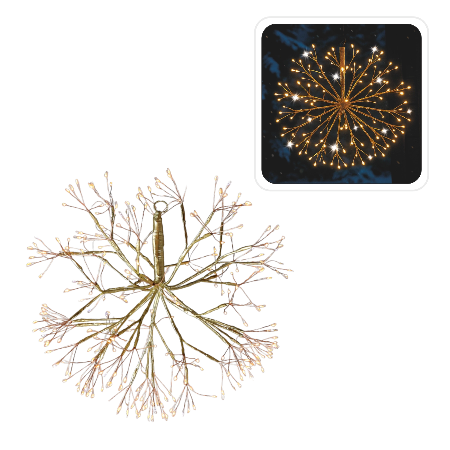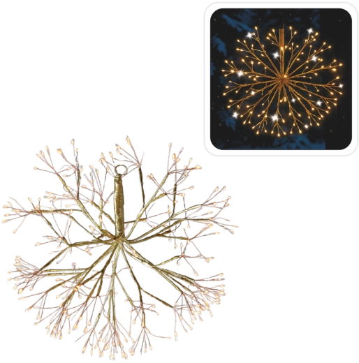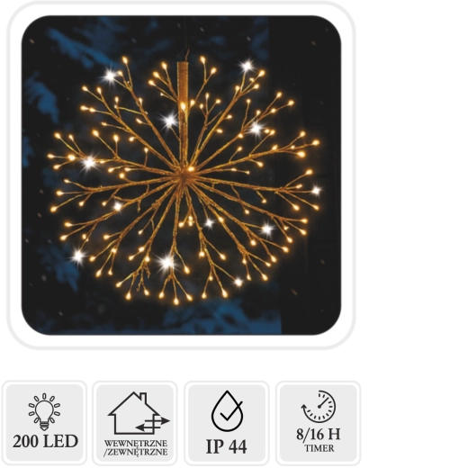 Rozzařte svůj domov i zahradu kouzelnou závěsnou ozdobou ve tvaru jmelí v elegantním zlatém provedení. Díky 288 micro LED v odstínu teplá bílá se subtílním studeným zábleskem vytváří působivý sváteční efekt. Venkovní i vnitřní použití zajišťuje IP44, praktický časovač 8/16 h se postará o automatické zapínání a vypínání. Průměr 40 cm, průhledný kabel a úsporný provoz pro snadnou a stylovou výzdobu.
