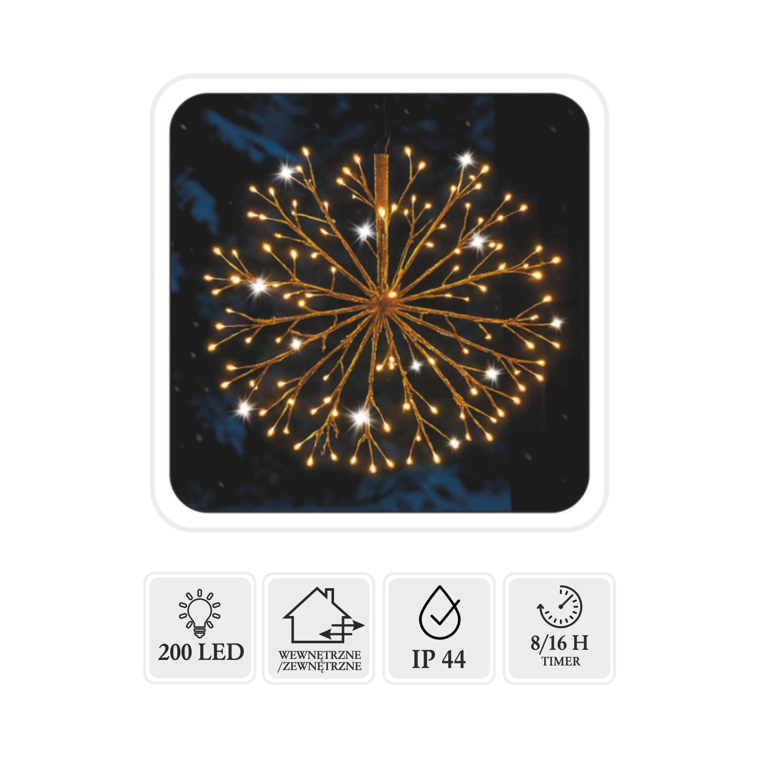 Integrovaný časovač 8/16 h zajišťuje pohodlné používání bez nutnosti denní obsluhy. Průhledný napájecí kabel dlouhý 5 m usnadňuje umístění a neruší vzhled dekorace. Úsporný příkon 3,6 W šetří energii a přitom poskytuje výrazný světelný efekt.