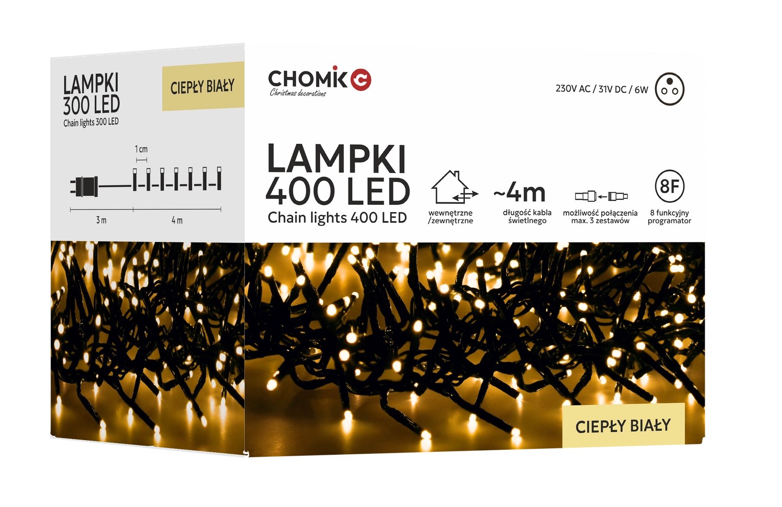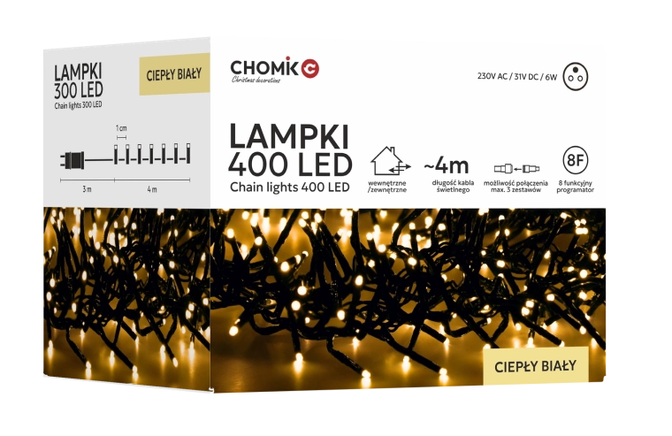 LED řetěz Cluster s 400 diodami přináší efektní, husté světlo, které vynikne na vánočním stromku, zábradlí, stěně i na zahradě. Teplá bílá barva navodí útulnou atmosféru a díky ovladači s pamětí a časovačem si snadno nastavíte oblíbený režim bez nutnosti opětovného programování.