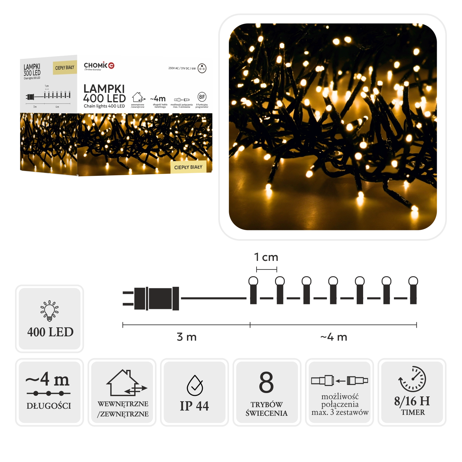 Odolnost vůči povětrnosti IP44, bezpečné nízkonapěťové napájení a možnost propojit až 3 sady dělají z tohoto světelného řetězu univerzální dekoraci pro sezónu i celoroční využití.