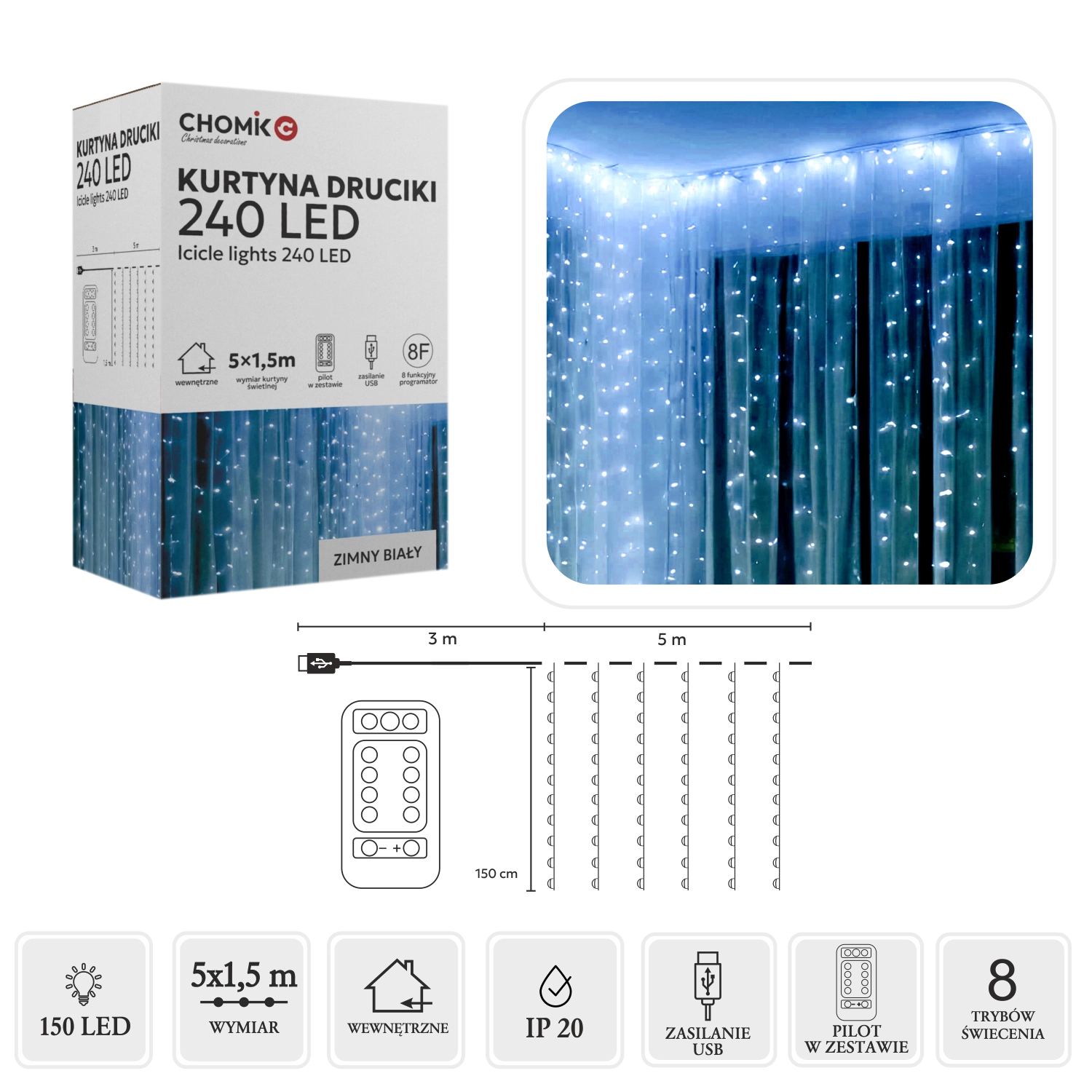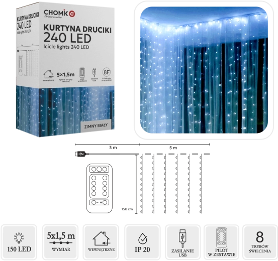 Elegantní světelná opona s mikro LED v barvě studená bílá vykouzlí ledový třpyt na oknech, stěnách i balkonech. Nabízí 240 LED na ploše 5 × 1,5 m, praktické USB napájení a dálkové ovládání s 8 světelnými programy. Díky krytí IP44 je vhodná pro interiér i exteriér, stříbrný vodič dodá dekoraci jemnost a eleganci.