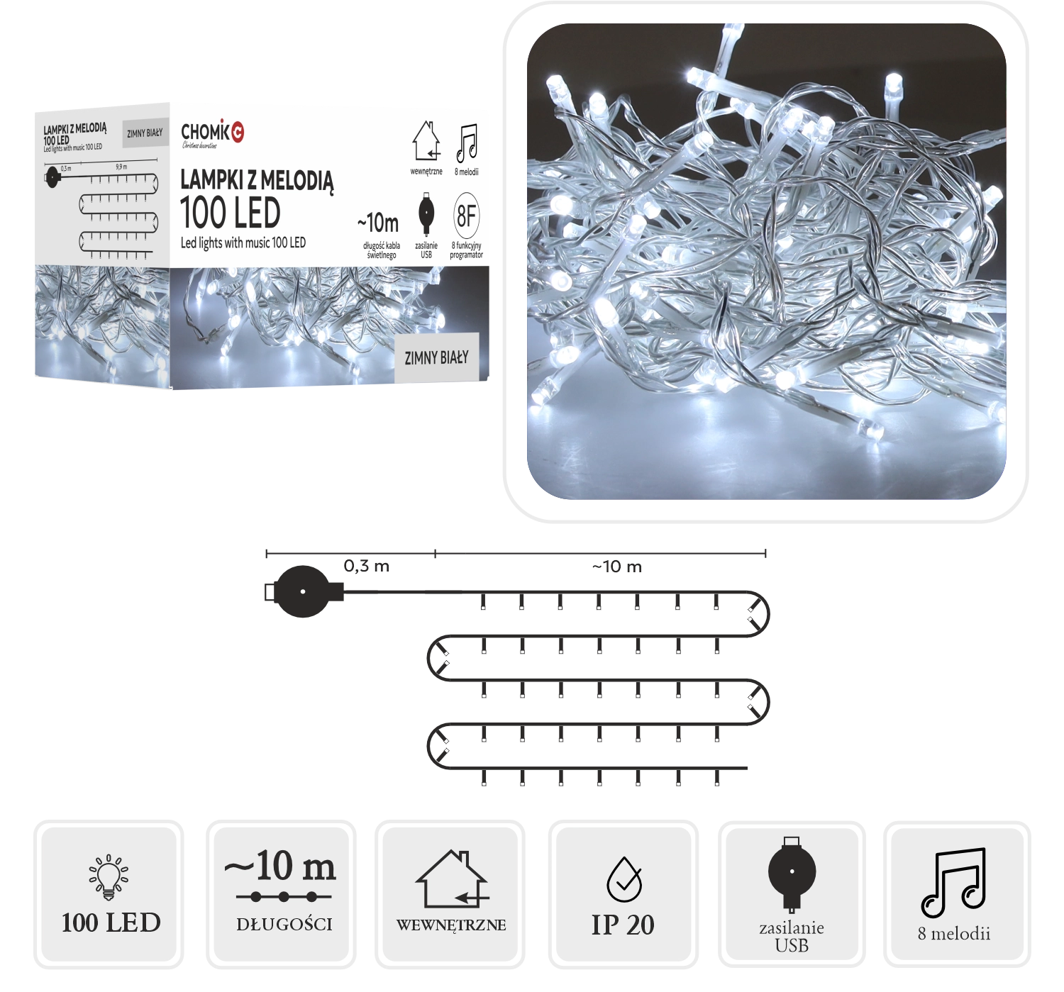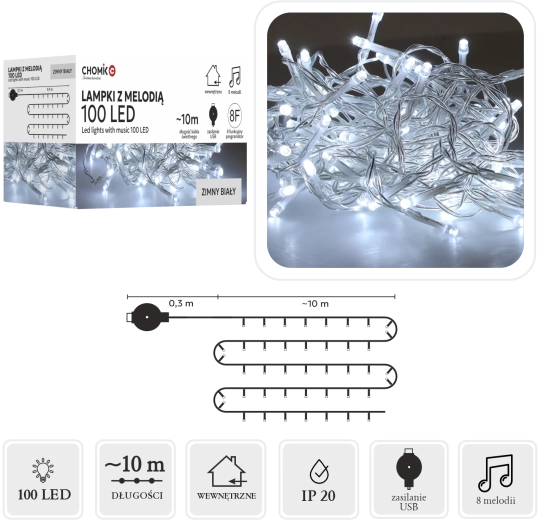 LED vánoční řetěz s melodií USB, 100 LED, studená bílá, 10 m