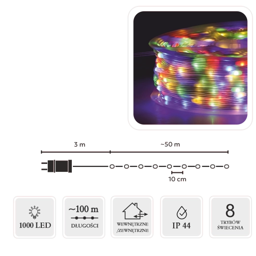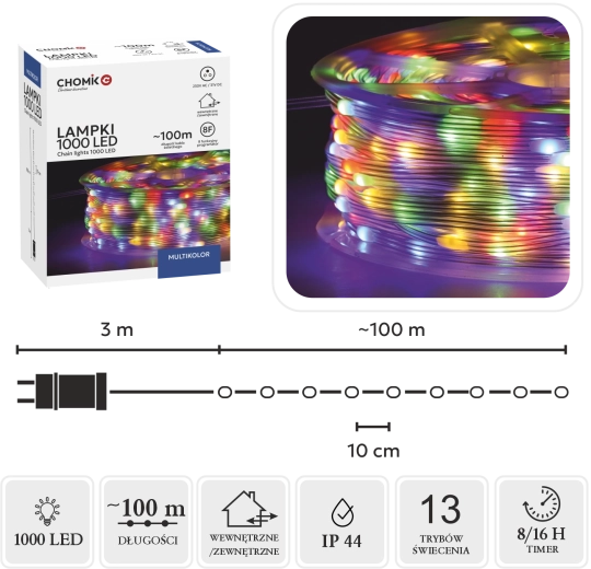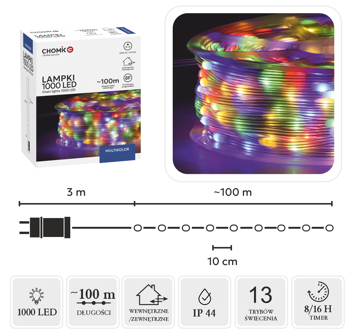Praktický ovladač s 8 funkcemi má paměť posledního nastavení a časovač 8/16 h pro automatické zapínání a vypínání. Cívka v balení usnadní manipulaci, skladování i opakované použití. Díky krytí IP44 je řetěz vhodný do interiéru i chráněných venkovních prostor.