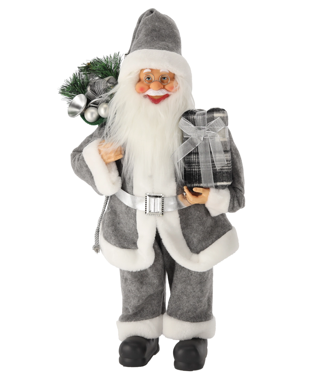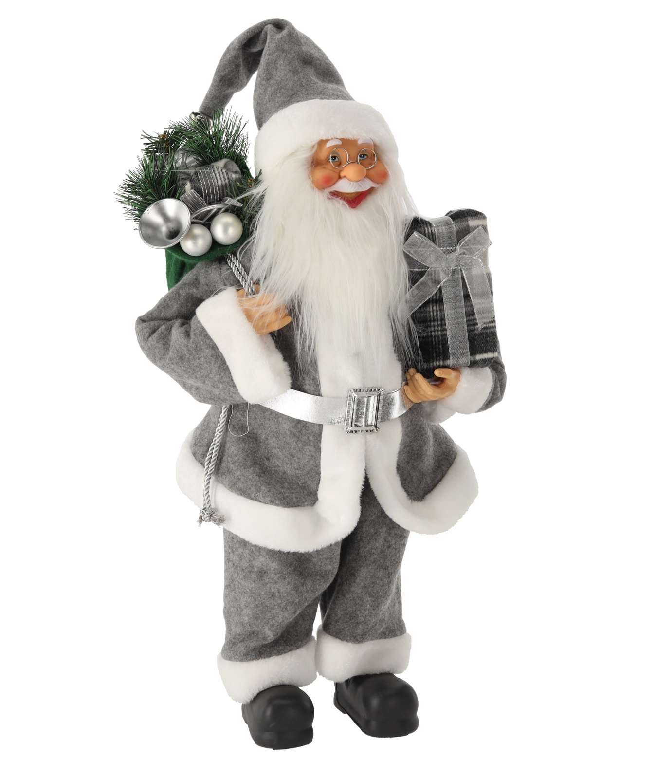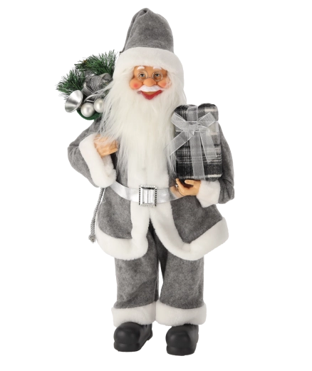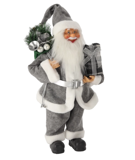 Tato dekorativní figurka SANTY v šedém provedení se perfektně hodí do obývacího pokoje, haly, kanceláře či hotelového lobby. Díky kvalitním materiálům a pevnému zpracování působí realisticky a zůstane krásná i po několika sezónách. Šedý oděv s kožešinovým lemem, stříbrnými detaily a černými botami snadno sladíte s moderním, skandinávským i glamour stylem.