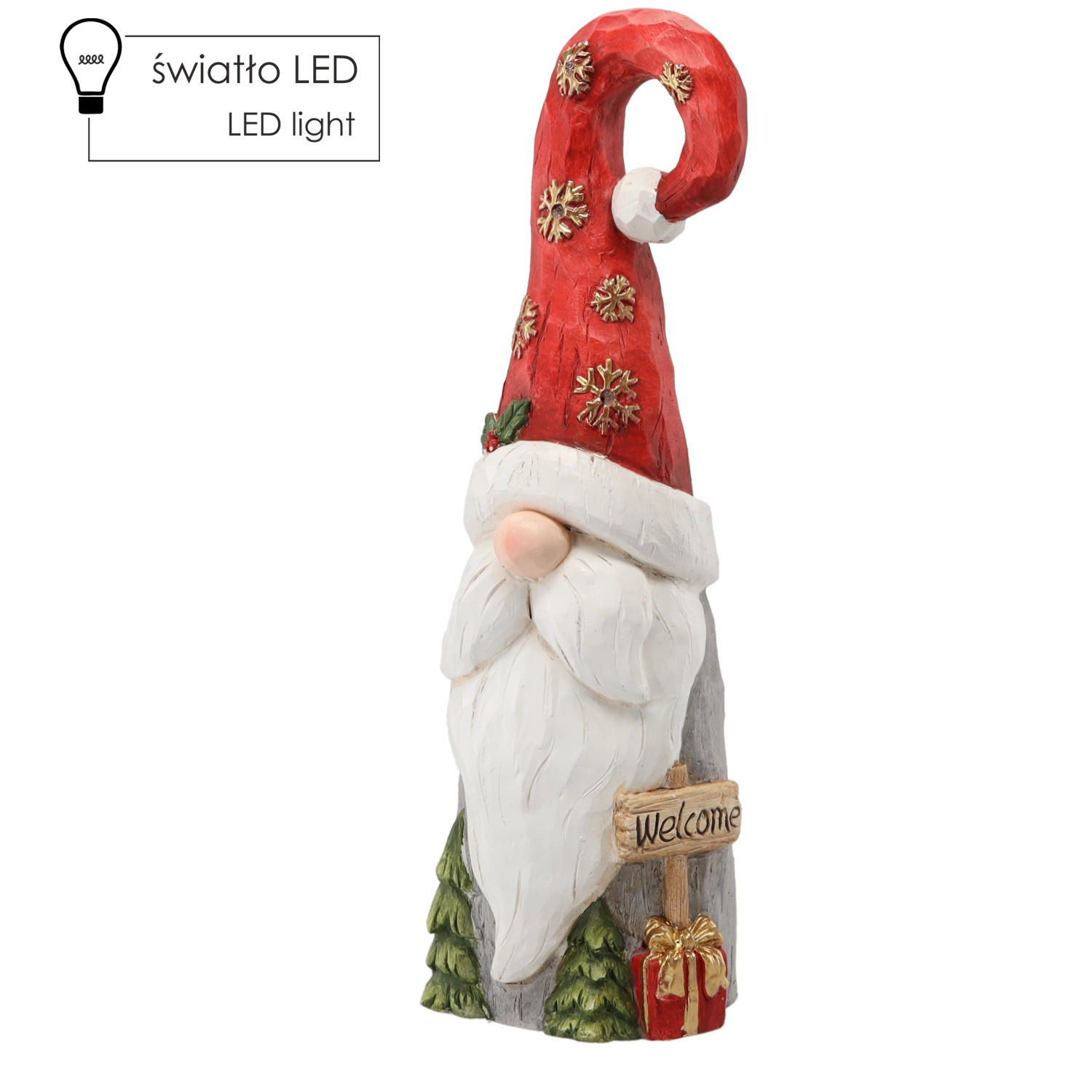 Vytvořte doma kouzelnou sváteční atmosféru s touto stylovou vánoční figurkou skřítka se santovskou čepicí a integrovaným LED osvětlením. Díky impozantní výšce 66 cm, detailnímu provedení a efektním světelným prvkům se stane výraznou dekorací na komodě, konzoli i v předsíni. Odolný materiál z magnezitové směsi zajišťuje stabilitu a dlouhou životnost.