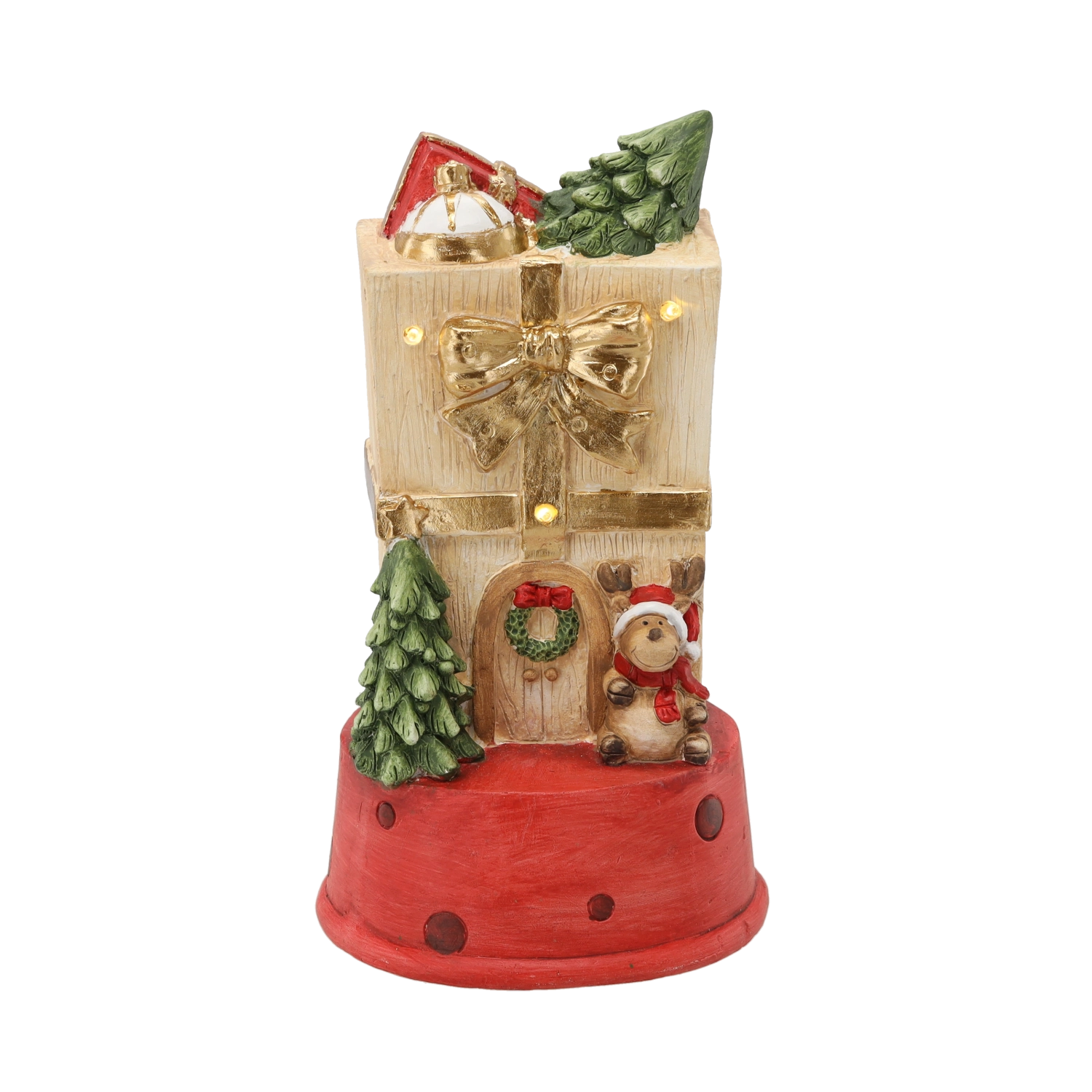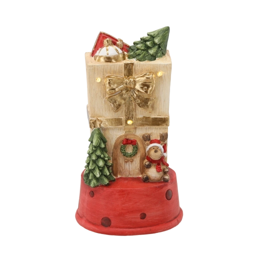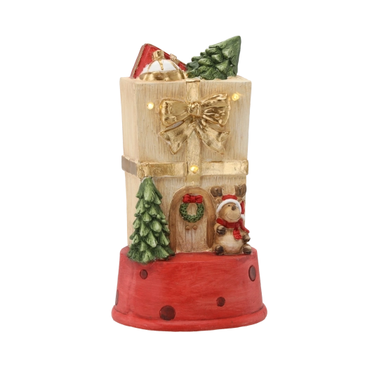 Tato detailně zpracovaná vánoční dekorace ve tvaru dárkového domečku s jelenem vnese do interiéru teplo a pohodu. Integrované LED světýlka dodají jemný svit, který krásně podtrhne sváteční výzdobu bez oslnění.