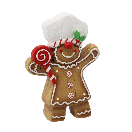 Tato figurka ve stylu perníčku s kuchařskou čepicí a roztomilými cukrářskými doplňky oživí každý vánoční koutek. Integrované teplé LED diody jemně prosvítají skrz dekorativní detaily a navodí příjemnou sváteční náladu ve dne i večer.