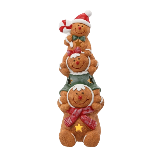 Vytvořte si doma kouzelnou vánoční scenérii s figurkou tří perníčkových postaviček, které jemně prosvětluje integrované LED osvětlení. Dekorace vyniká kvalitním zpracováním z odolné magneziové směsi a univerzálními rozměry 16 × 16 × 43 cm, které se hodí na většinu polic, krbových říms i vstupních hal.