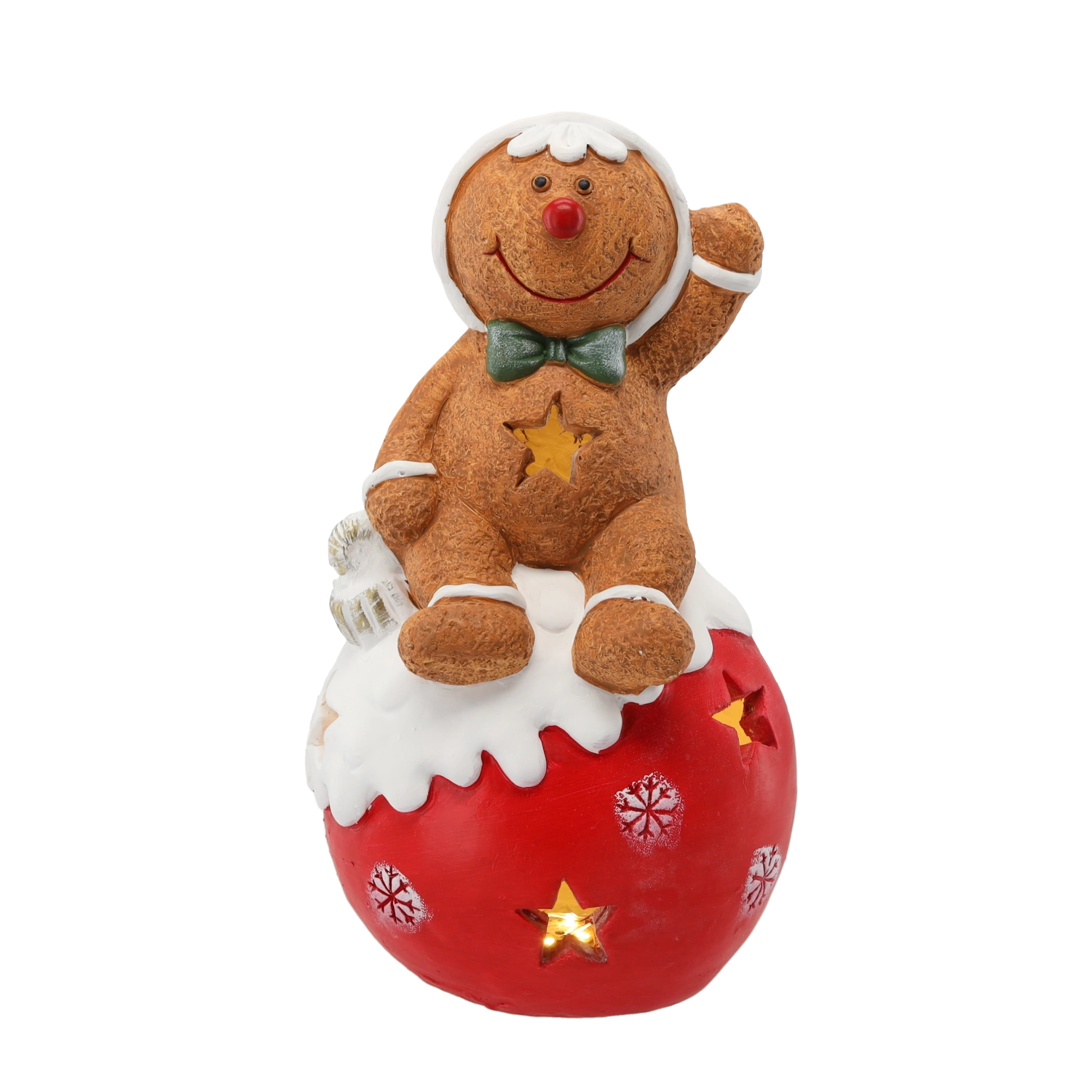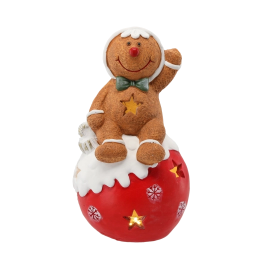 Roztomilá vánoční dekorace v podobě perníčkového mužíčka sedícího na ozdobné baňce dodá vašemu domovu kouzelnou atmosféru. Integrované LED osvětlení vytváří hřejivý efekt, odolný materiál z magnezitové keramiky zaručuje stabilitu a dlouhou životnost. Ideální jako sváteční výzdoba na poličku, komodu či parapet.