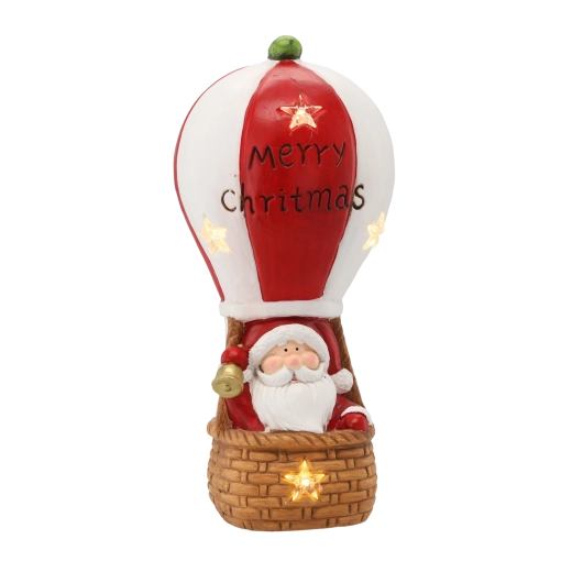 Santa v horkovzdušném balónu s nápisem „Merry Christmas“ je výrazný a hravý prvek, který se hodí na stůl, polici i komodu.