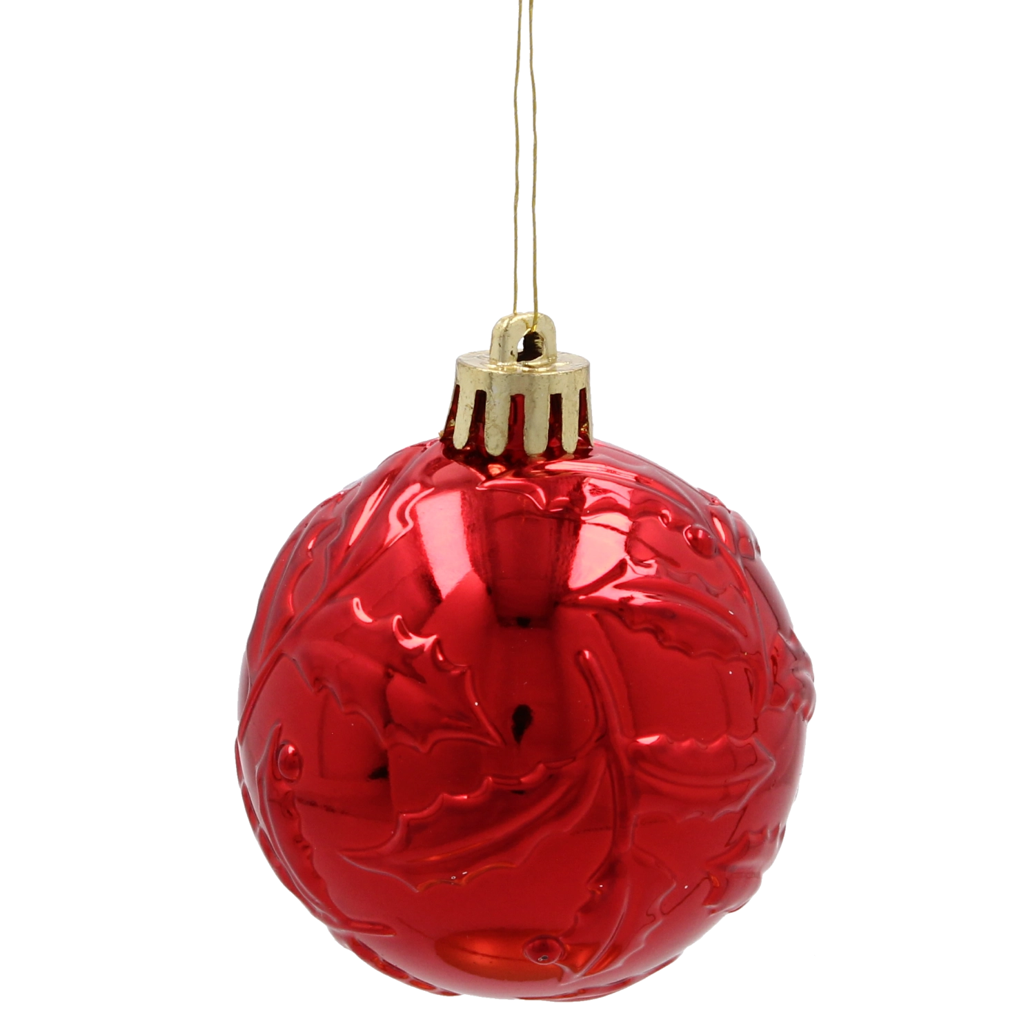 Červené ozdoby s jemným reliéfem či leskem podtrhnou tradiční sváteční styl a krásně kontrastují se zelenými větvemi.