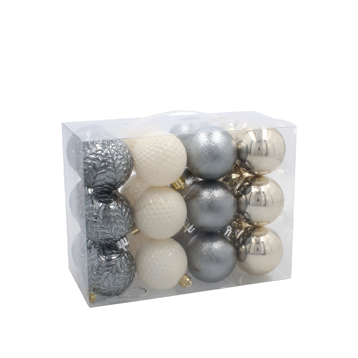 Dopřejte svým Vánocům nadčasovou eleganci. Tato pečlivě sladěná sada 24 plastových koulí v barvách šampaňské, šedé a bílé nabízí vyváženou kombinaci lesklých, matných a třpytivých povrchů, které dodají dekoru hloubku, světelné odlesky a prémiový vzhled.