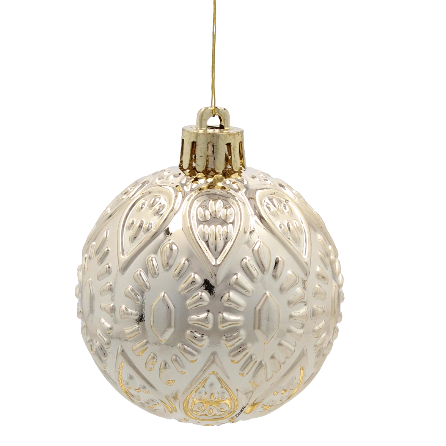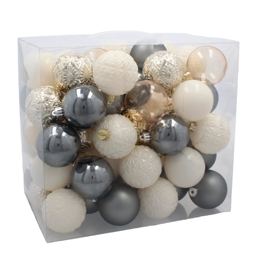 Elegantní sada 66 vánočních ozdob o průměru 6 cm v tónech šampaňská, šedá a bílá dodá stromku harmonii a styl. Odolný plast zajišťuje bezpečnou manipulaci, zatímco lesklé, matné a třpytivé povrchy přinášejí hloubku a sváteční jiskru do každého interiéru.