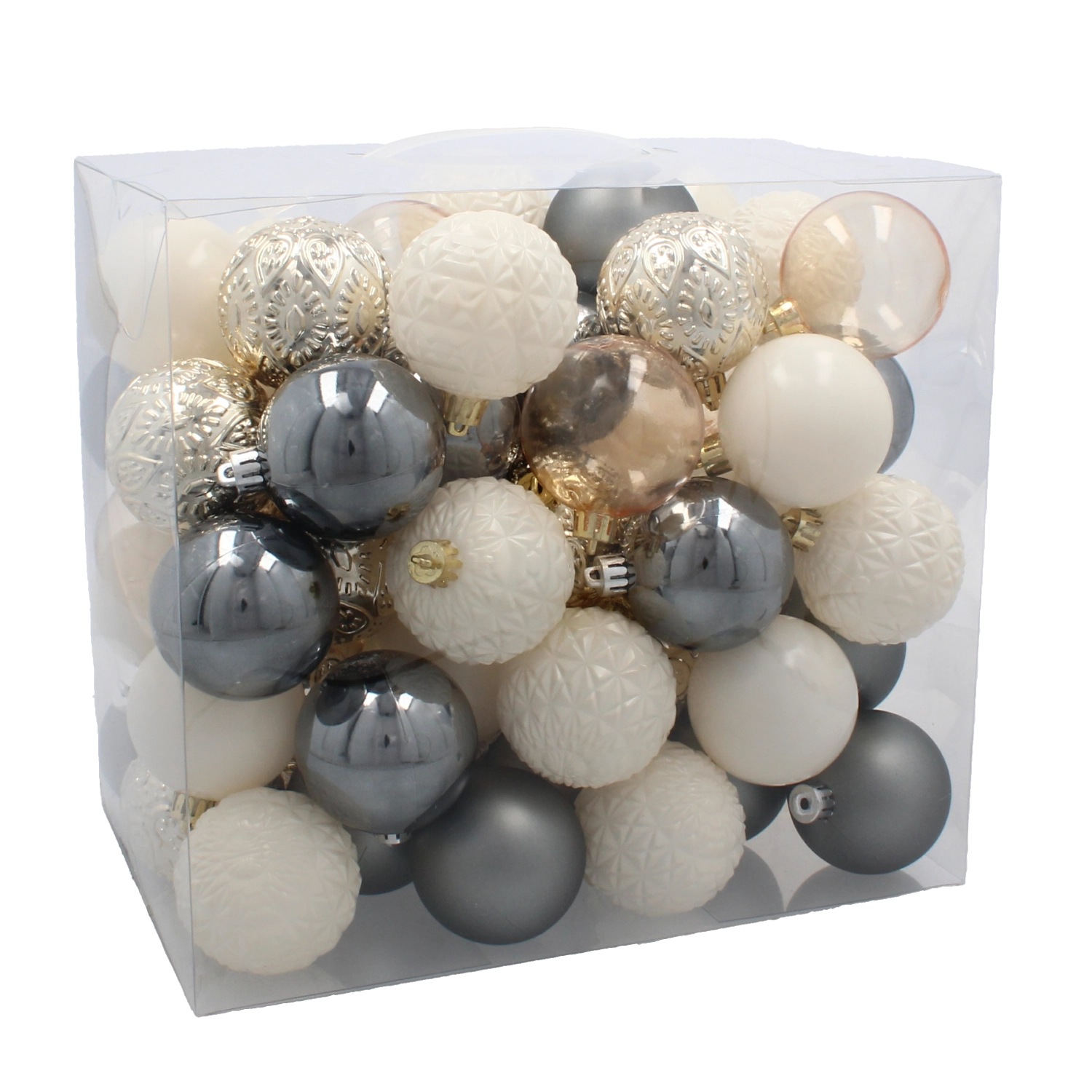 Sada vánočních koulí 6 cm – šampaňské, šedé a bílé (66 ks)
