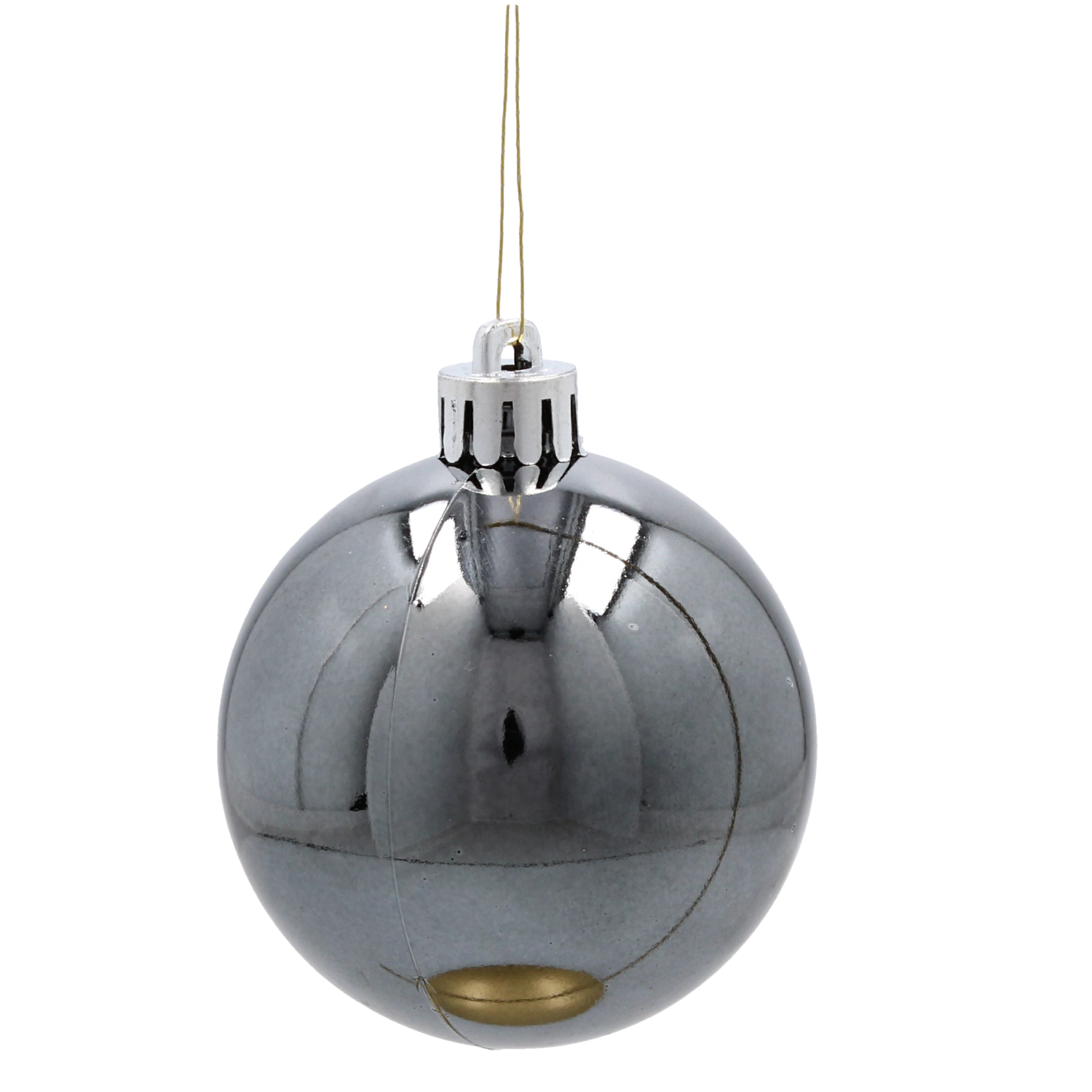 Lesklé, matné a třpytivé koule vytvářejí vyváženou kompozici s jemným leskem a bohatou texturou, která zvýrazní světelné odrazy i dekorace na větvích.