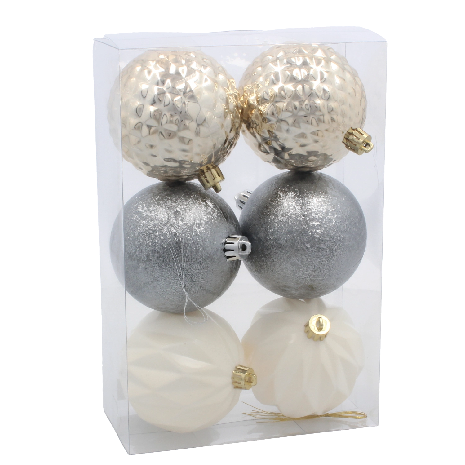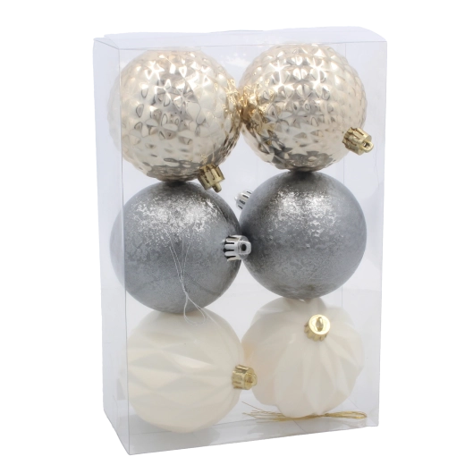 Tato pečlivě sladěná sada skleněných baněk kombinuje texturované, matné i hladké povrchy pro jemný moderní efekt. Barevná paleta šampaňské, stříbrné a bílé se snadno kombinuje s ostatními dekoracemi a vytváří ucelený vzhled bez vizuálního chaosu.