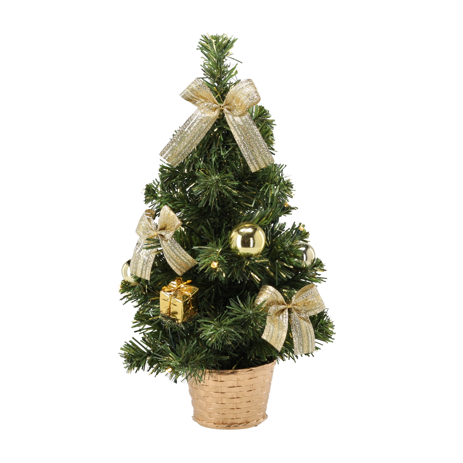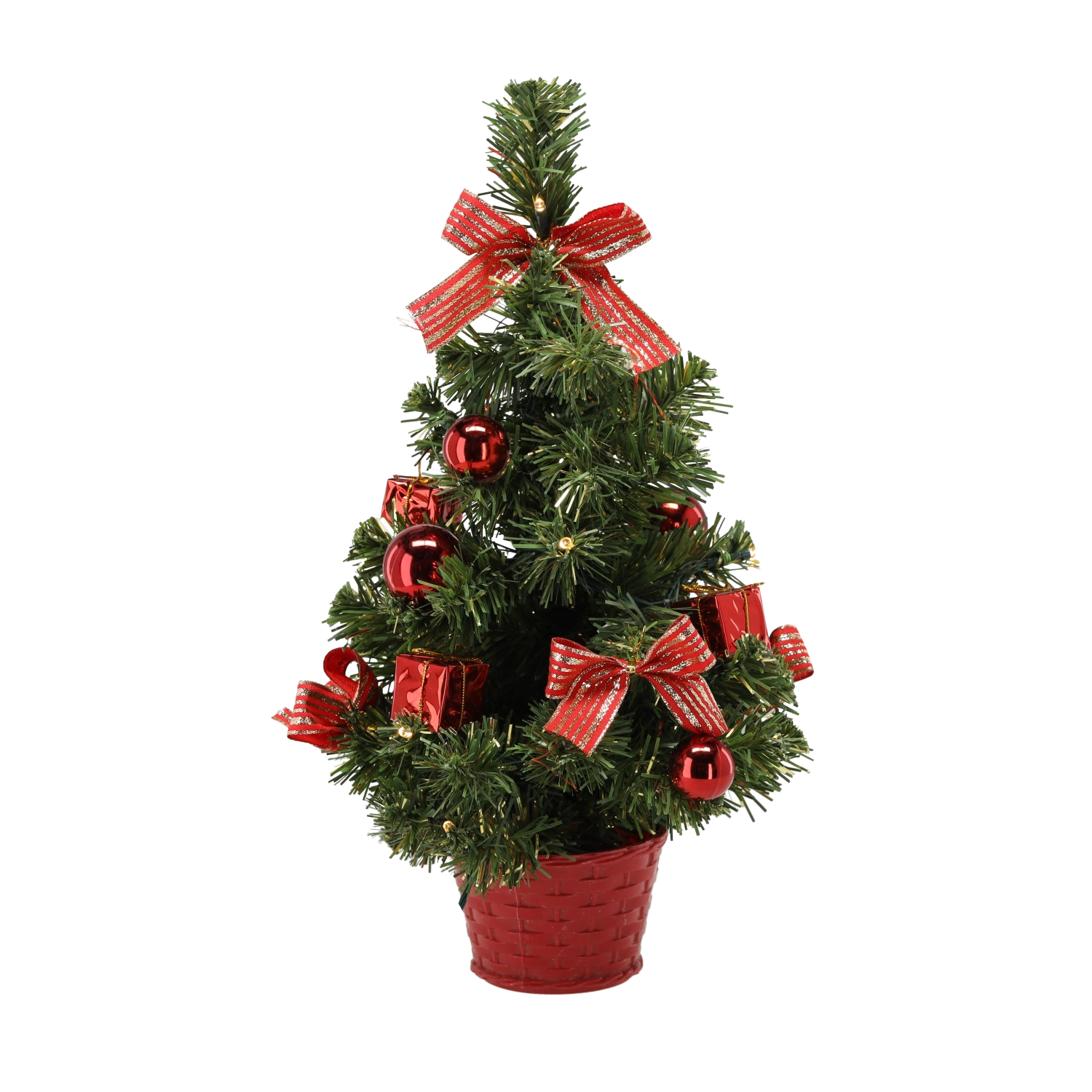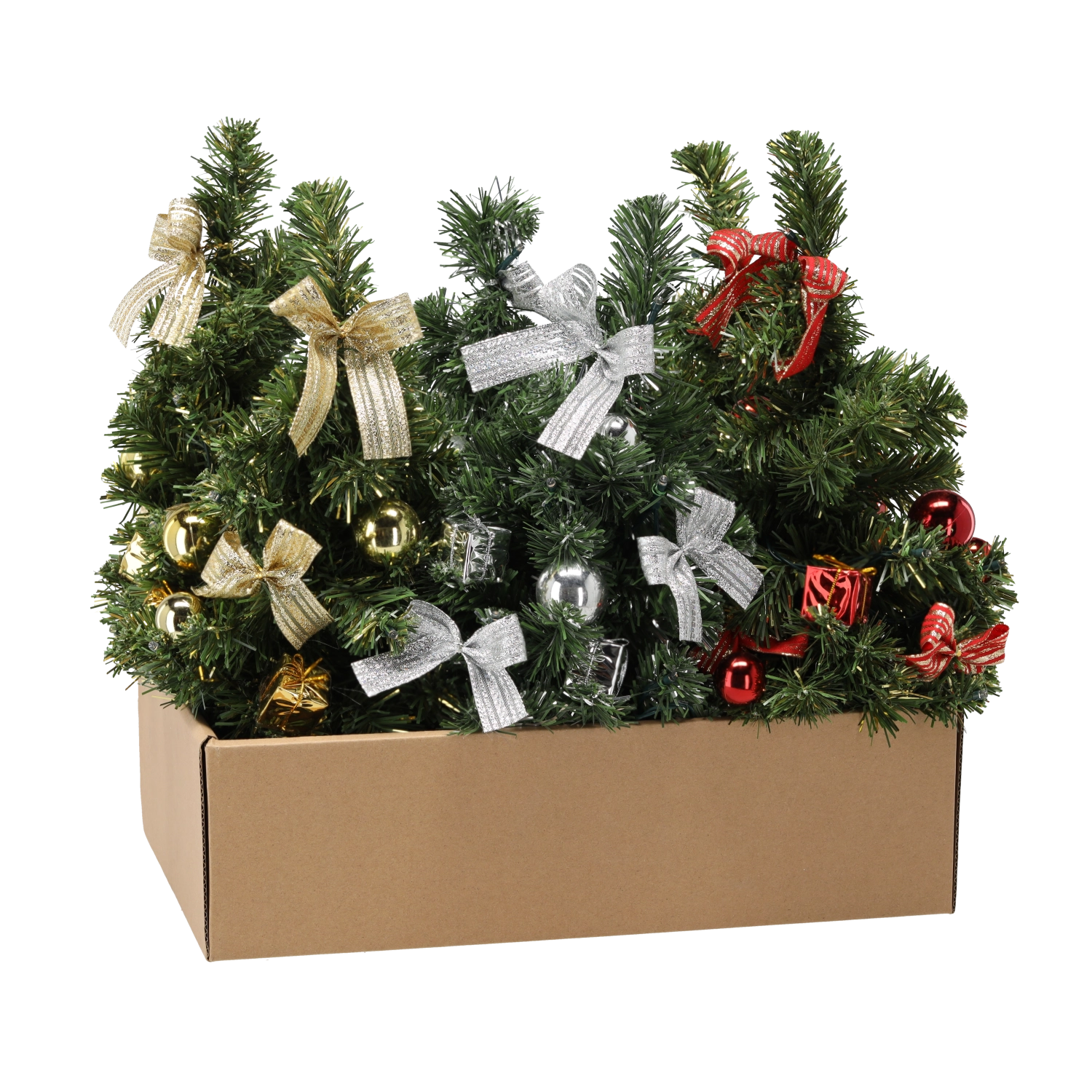 Stromek je doplněn mašličkami a baňkami v červených, stříbrných či zlatých tónech – stačí vybalit a vystavit.