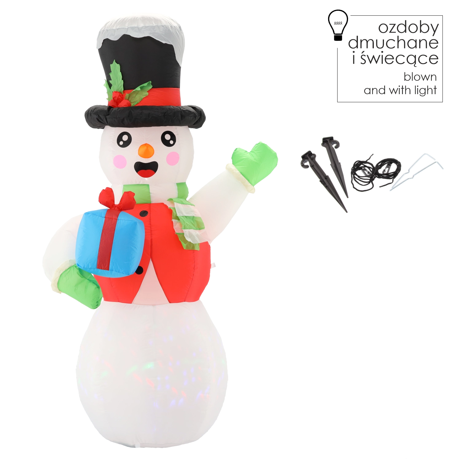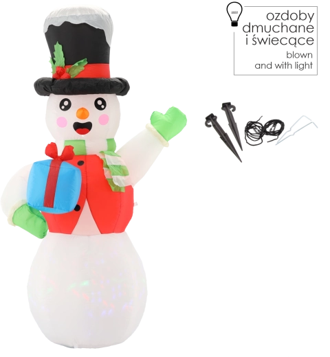 Okouzlete sousedy i kolemjdoucí velkolepou vánoční dekorací, která se během chvilky sama nafoukne a rozzáří. Vysoký sněhulák s černým kloboukem, šálou a dárkem v ruce přináší pohádkové světelné efekty díky kombinaci bílé LED a rotujícího vícebarevného osvětlení.