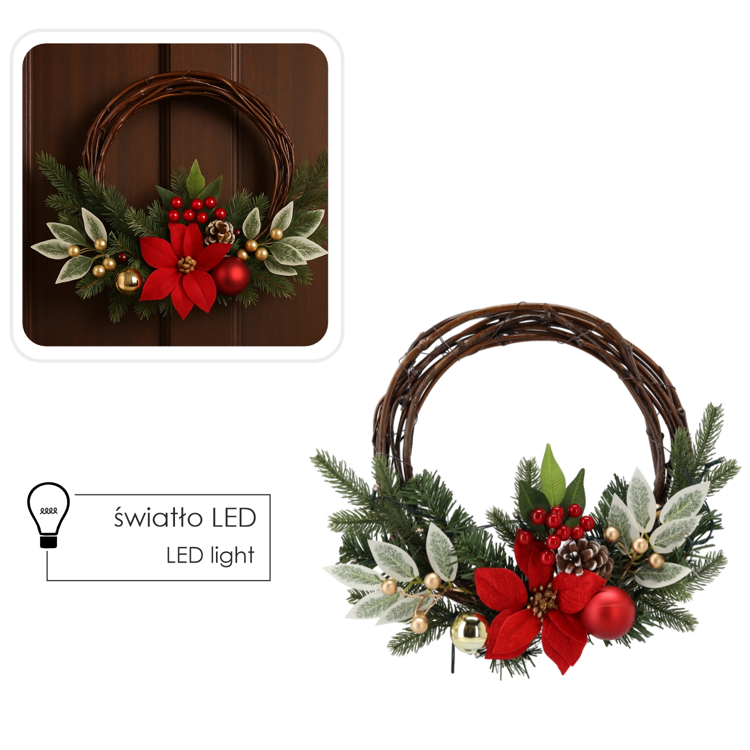 Vneste do svého interiéru tradiční vánoční kouzlo. Tento věnec je vyroben z kvalitního proutí a zdoben bohatou směsí zeleně, bobulek, šišek a červeno‑zlatých akcentů. Jemné LED osvětlení podtrhuje detaily a vytváří příjemnou světelnou scenérii po celé svátky.