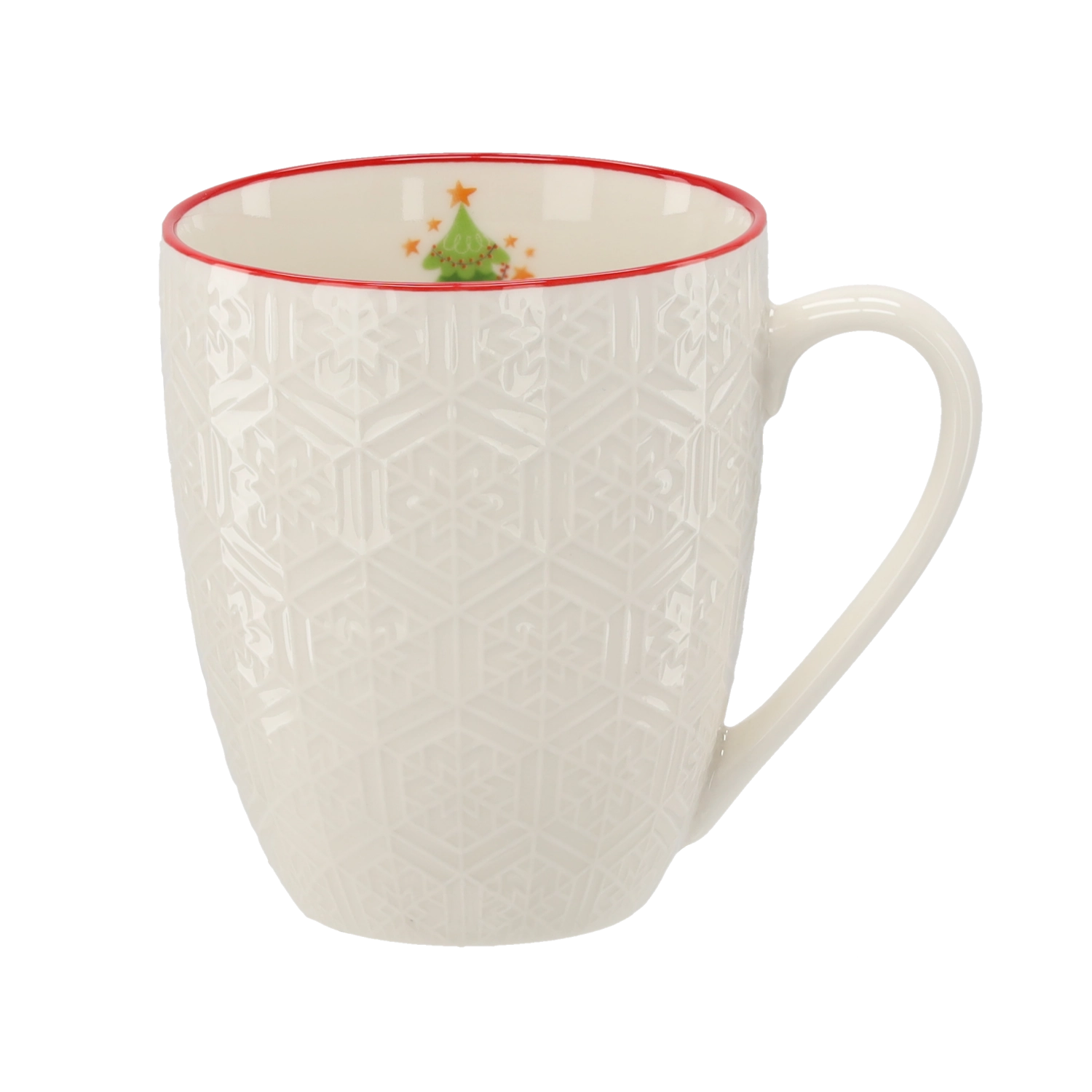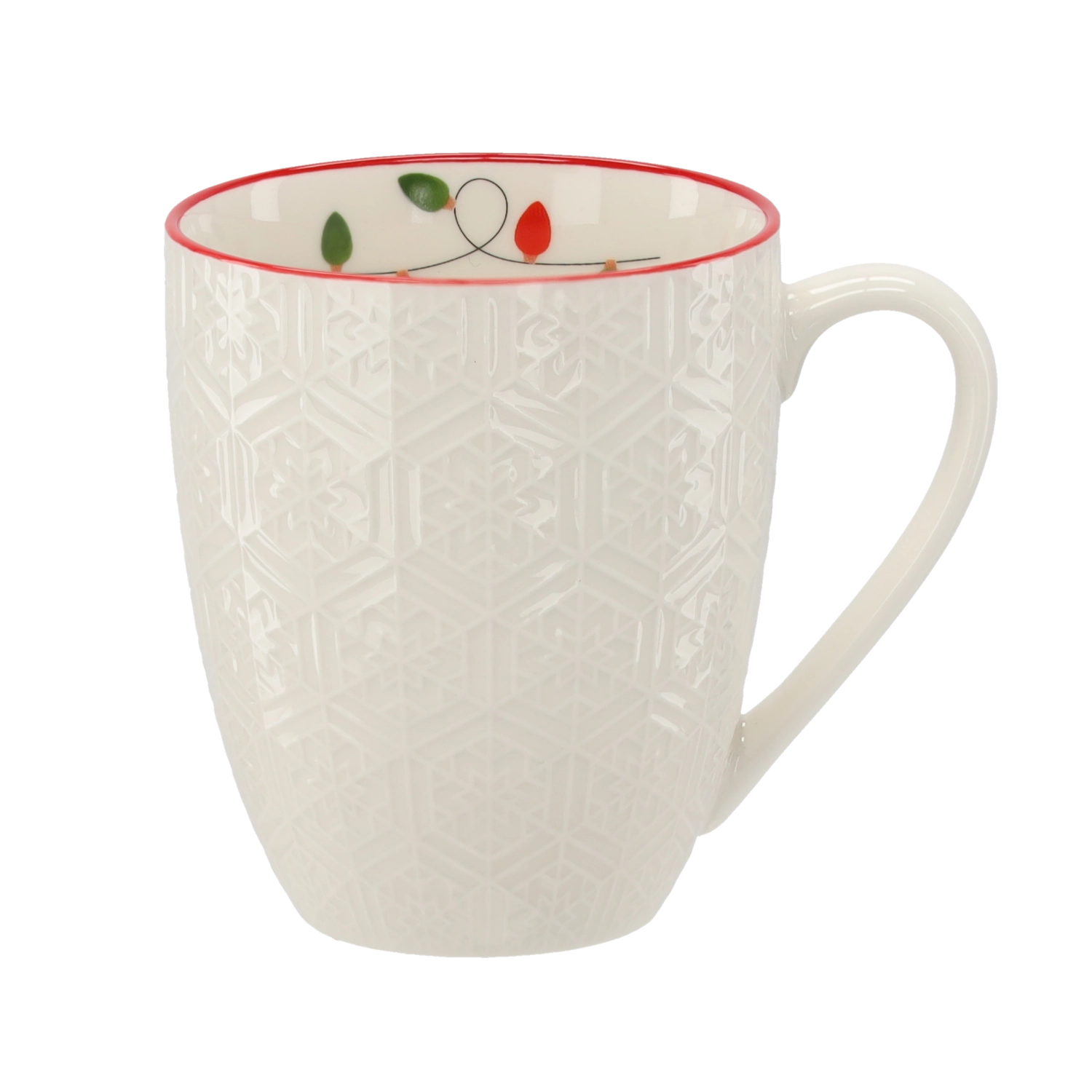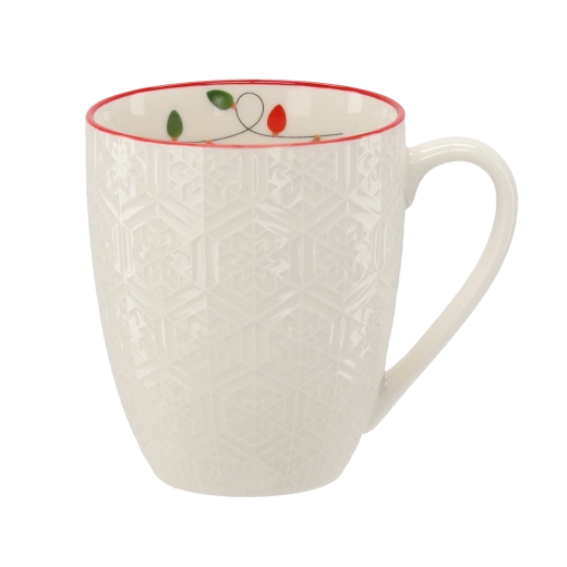 Jemný geometrický reliéf v kombinaci s červeným lemem dodává hrnku výjimečný vzhled, který podtrhne vánoční atmosféru u každého stolování.