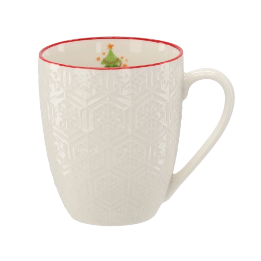 Užijte si zimní pohodu s tímto elegantním porcelánovým hrnkem o objemu 400 ml, který zdobí jemný reliéf, sváteční motivy a červený lem. Ideální pro horký čaj, kávu či kakao, skvěle doplní vánoční atmosféru a stane se stylovým doplňkem kuchyně.