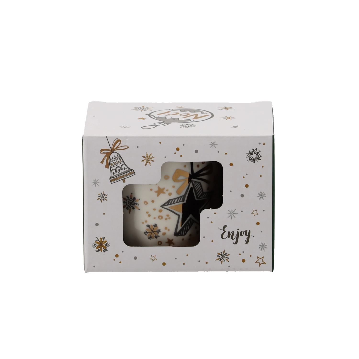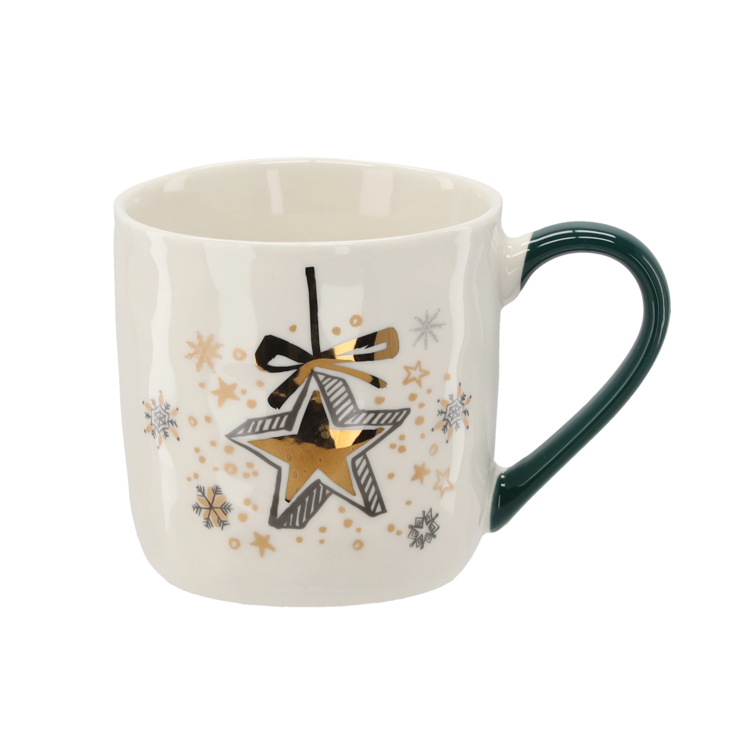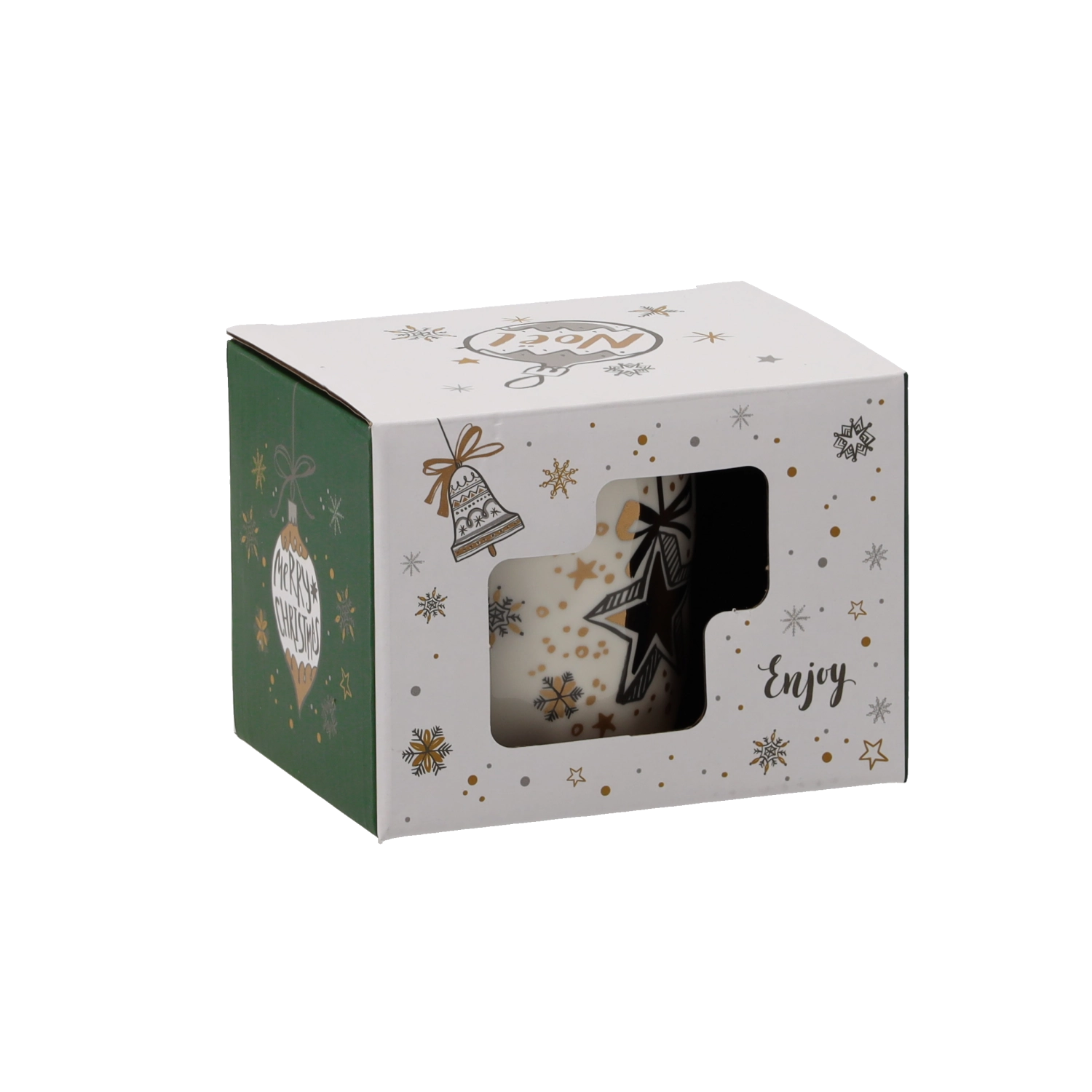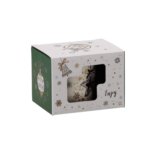 Udělejte si radost nebo potěšte své blízké porcelánovým hrnkem s jemným krémovým nádechem a svátečními detaily ve zlaté, zelené a bílé. Unikátní motivy hvězdiček, zvonků a baněk podtrhují vánoční atmosféru a promění každý horký nápoj v příjemný rituál.