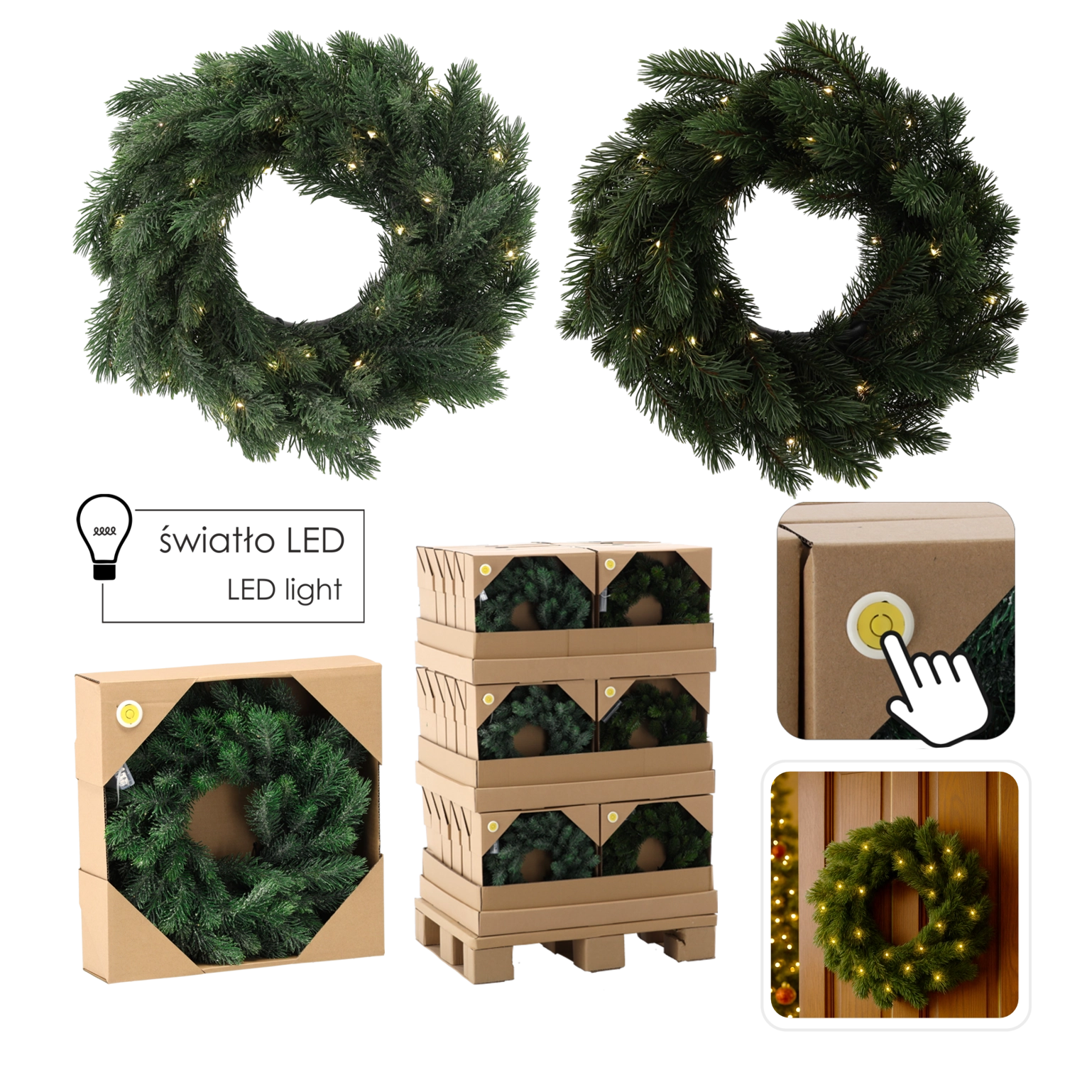 Praktické tlačítko Try Me pro rychlé vyzkoušení a bateriové napájení 3× AA vám umožní umístit věnec kamkoli bez kabelů.