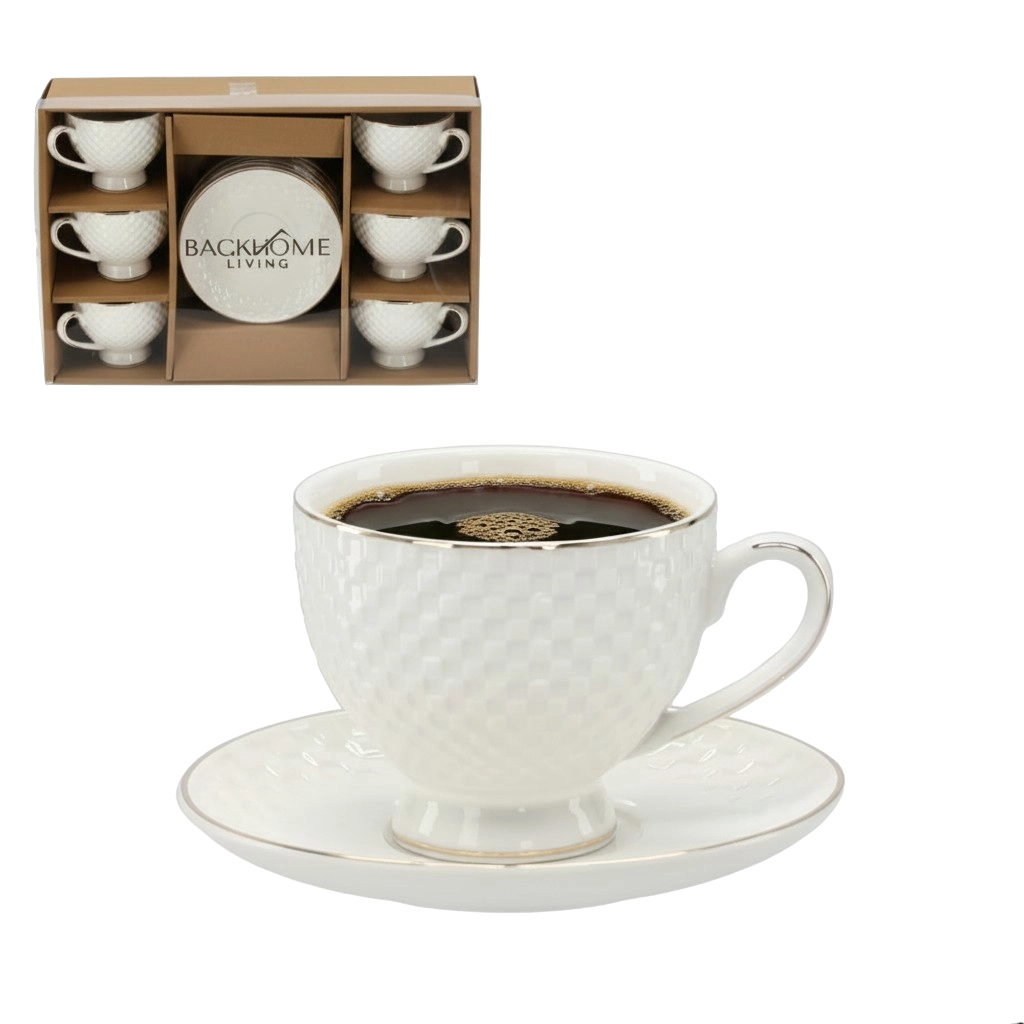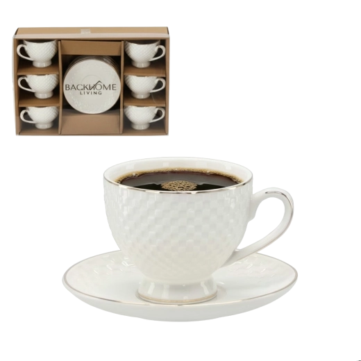 Tato stylová sada šálků s podšálky přináší harmonii elegance a praktičnosti. Reliéfní povrch vytváří atraktivní strukturu a zlatý dekorativní proužek podtrhuje luxusní vzhled, který vynikne na každém stole.