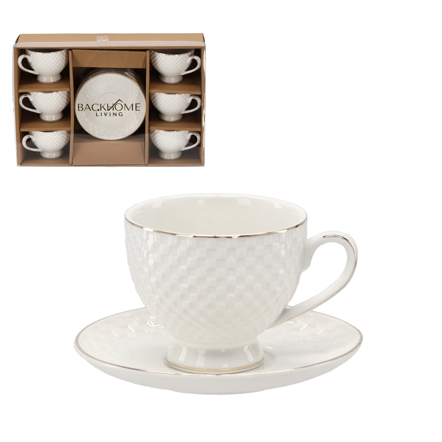 Elegantní sada šesti reliéfních šálků s podšálky o objemu 250 ml, zdobená jemným zlatým ozdobným proužkem. Decentní reliéf a nadčasový design dodávají servisu výjimečný charakter – ideální pro každodenní použití i slavnostní příležitosti.